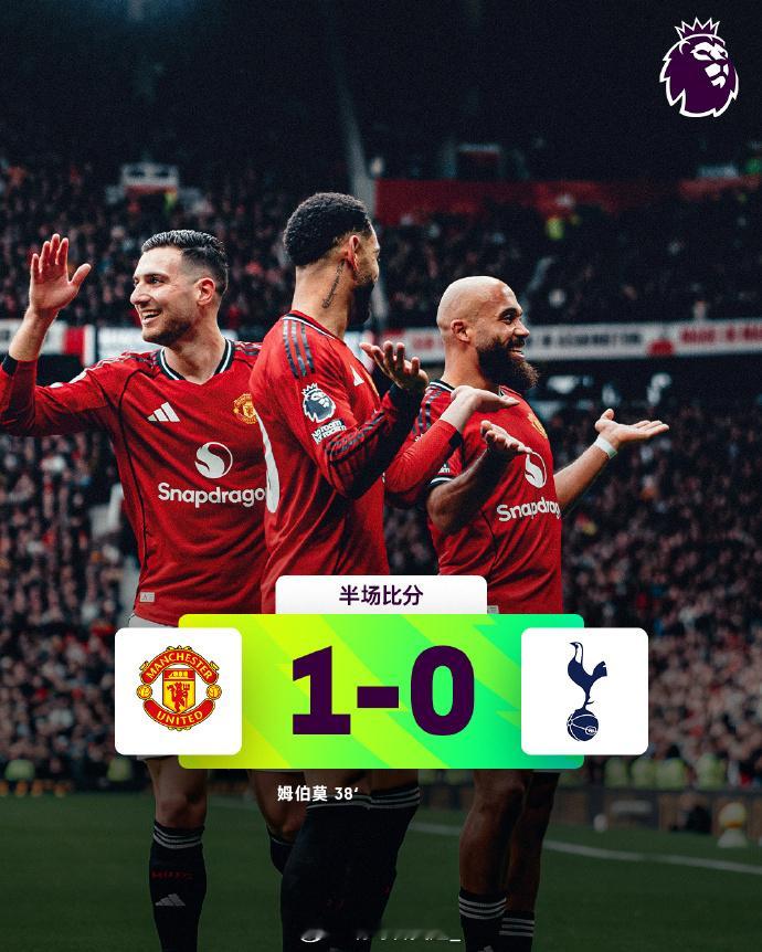 半场结束!曼联凭借着姆伯莫的进球暂时1比0领先十人热刺!吆喝2比2的没得了