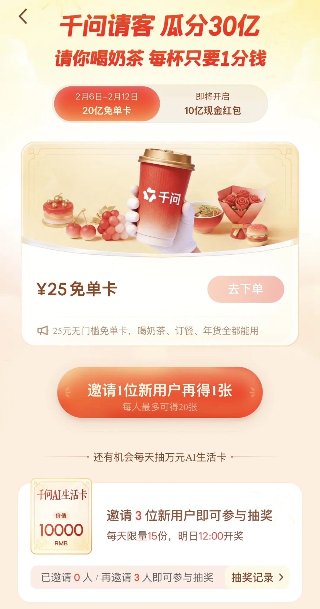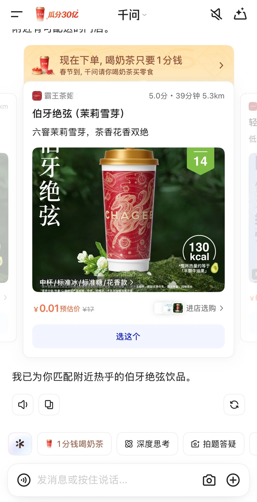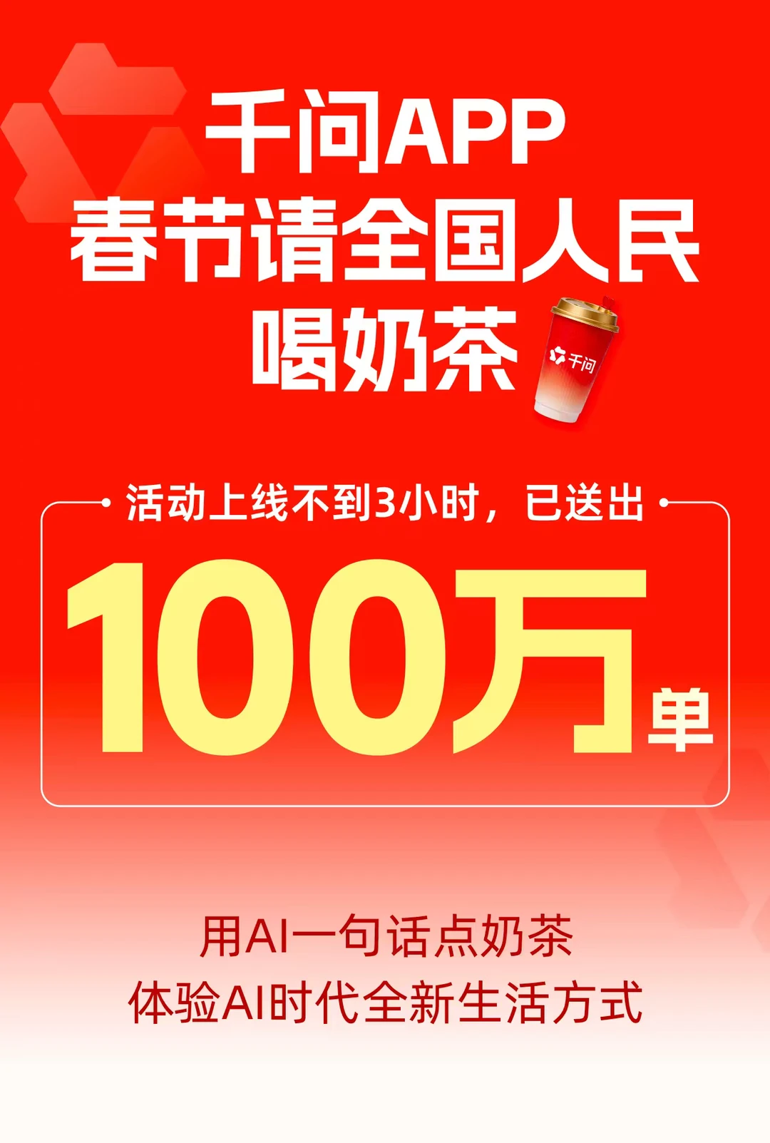 这次跟风体验了千问的春节免单,蹭了杯CHAGEE的,个人表示很香!我是喝到了之后才约其他的小伙伴一起来薅的,大家纷纷表示好评!活动上线不到3小时,就送出了100万单奶茶,有态度也有力度,赞!