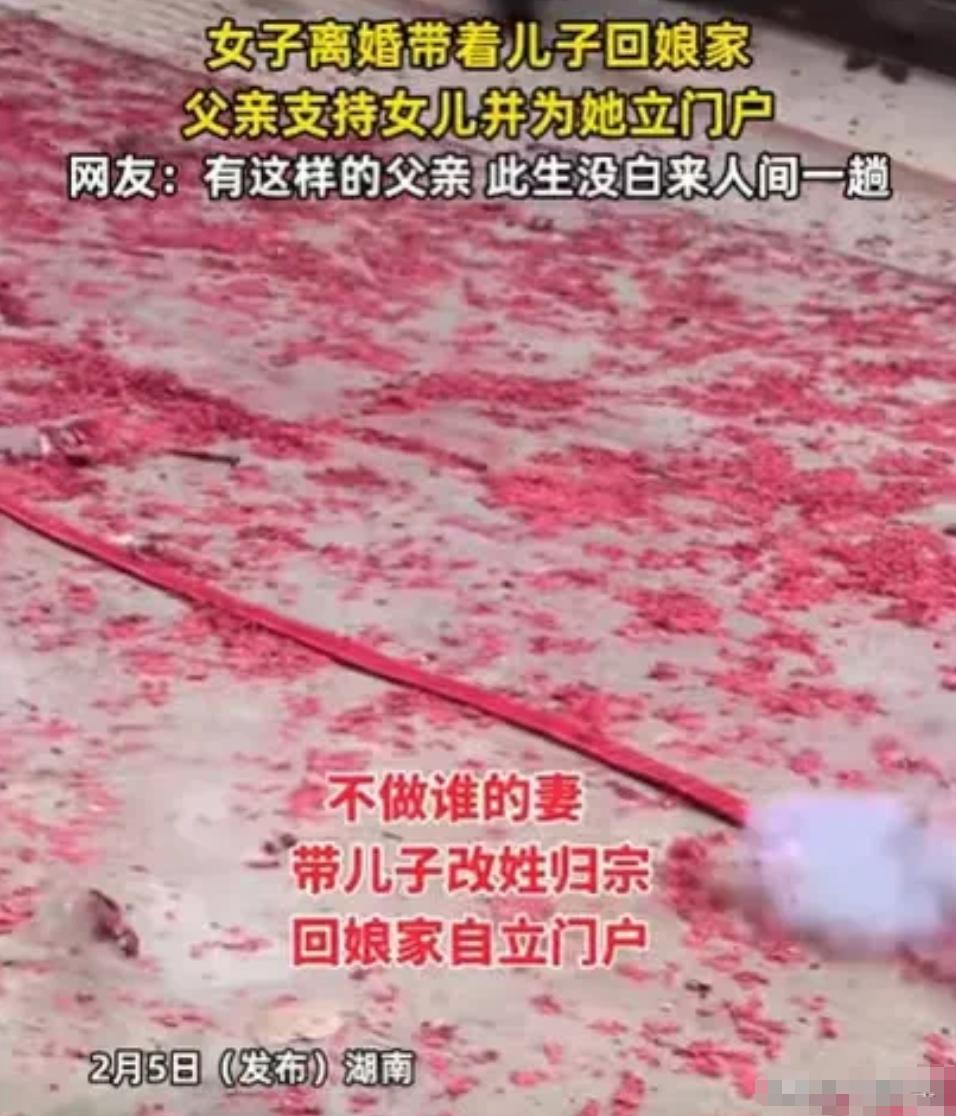 “这个父亲太伟大了。”湖南,女子离了婚,女子带着儿子,净身出户,走投无路下,女子回娘家,她回去之前忐忑不安,害怕成为娘家的笑柄,不料父亲一看女儿带着外孙回家,就给了他们一个温暖的怀抱,带着外孙改姓,直接给女儿立门户,他放上鞭炮,欢迎女儿的归家。 那挂鞭炮噼里啪啦响了一分多钟,全村的人都听见了动静。女子蹲在院门口,眼泪止不住地往下掉,她之前设想过无数种最坏的结局。她甚至在娘家村口徘徊了快一个小时,迟迟不敢抬脚进门。 她知道,在老家的村子里,离婚从来都不是一件光彩的事。尤其她还是净身出户,没带走婆家一分钱,只抱着年幼的儿子,一身狼狈地逃回来。她怕村里的七大姑八大姨背后嚼舌根,说她没本事留不住男人、守不住家。她更怕自己的父母觉得丢脸,把她拒之门外,或者虽让她进门,却给她摆脸色、冷嘲热讽。 可她万万没想到,父亲看见她和儿子的那一刻,没有问一句离婚的缘由,没有指责她半句不懂事,更没有提半句“丢面子”的话。父亲快步走上前,先是伸手摸了摸外孙的头,又一把将女儿搂进怀里,声音沙哑却坚定,说“回来了就好,爸在呢”。 就这一句话,瞬间击溃了女子所有的坚强。她在父亲的怀里哭出了声,所有的委屈、恐惧和无助,在那一刻都有了宣泄的出口。年幼的儿子看不懂妈妈为什么哭,只是紧紧抱着妈妈的腿,怯生生地叫了一声“外公”。 父亲听见外孙的叫声,眼眶也红了。他牵着女儿的手,又抱着外孙,把两人领进院子里,转身就去杂物间翻出了一挂鞭炮。他说,既然回来了,就是家里的人,得放挂鞭炮,告诉全村人,他的女儿和外孙,回家了。 放完鞭炮,父亲没有歇着,紧接着就开始忙活起来。他先去村里的村委会打听,怎么给女儿立门户,怎么给外孙改姓。很多村里人得知他的想法后,都来劝他,说他太冲动了。 有人说,嫁出去的女儿泼出去的水,让她在家里暂住几天就行了,没必要特意立门户,传出去会被人笑话。还有人说,外孙本来是跟着前夫姓的,改姓太麻烦,而且也不合老规矩,会得罪前夫家。 可父亲根本不听这些闲言碎语。父亲当着劝他的人的面,直接撂下一句话:“规矩都是人定的,人活着,总得有条路走。” 随后,父亲就带着相关的证件,陪着女儿去派出所办理立户手续,又带着外孙去更改了姓氏,让外孙跟着自己姓,也跟着女儿姓。办理手续的工作人员得知事情的来龙去脉后,都忍不住夸这位父亲有担当、明事理。 可能有人会觉得,不就是给女儿立个户、给外孙改个姓、放一挂鞭炮吗,算不上什么大事。可只有真正了解农村现状的人,才知道这位父亲的做法,需要多大的勇气,有多了不起。 在很多农村地区,封建思想依然存在。人们普遍认为,女儿嫁出去之后,就属于婆家的人了,户口要迁走,名字也要进婆家的宗谱,就算后来离婚了,再回娘家也只能算“借住”,算不上真正的家里人。 很多离异的女人回娘家后,只能挤在兄弟的房间里,吃饭要看嫂子或弟媳的脸色,连晾件衣服都要挑没人的时候,活得小心翼翼、低声下气。她们的父母就算心疼女儿,也大多只会偷偷给点钱、帮衬点,很少有人敢像这位湖南父亲一样,明目张胆地护着女儿,甚至给女儿立门户、让外孙改姓。 这位父亲没读过多少书,也不懂什么高深的道理,更没看过什么民法典,但他心里清楚,女儿是他身上掉下来的肉,外孙是他的亲外孙,他不能让自己的亲人受委屈、被欺负。他知道,光给女儿一口饭吃、一个地方住,根本不够。 他给女儿立门户,是想让女儿有自己的身份、有自己的地盘,不用再寄人篱下,不用看任何人的脸色。他给外孙改姓,是想给孩子一个归属感,让孩子知道,就算没有父亲,还有外公护着他,还有外婆疼着他,他不是无依无靠的孩子。 他放那挂鞭炮,更是一种态度。他要用这种最朴素、最直接的方式,告诉全村人,他接纳自己的女儿和外孙,谁也不能背后说闲话、欺负他们;他还要告诉女儿,离婚并不可耻,也不是她的错,就算遭遇了婚姻的失败,她还有娘家可以回,还有父亲可以依靠。 现在,女子在娘家过得很踏实。父亲给她收拾好了西边的小院,她每天学着种菜、养鸡,偶尔去镇上打零工,赚点零花钱。外孙每天跟着外公外婆,性格也越来越开朗,不再像以前那样怯生生的。 现实生活中,有太多离异女性,在婚姻失败后,既要独自抚养孩子,又要承受世俗的偏见和压力,她们大多孤立无援、举步维艰。她们最渴望的,从来都不是多么丰厚的物质生活,而是一份来自家人的接纳和支撑。 愿每一位身处困境的离异女性,都能遇到这样一位拎得清、有担当的父亲,都能有一个可以安心停靠的港湾。愿每一个无辜的孩子,都能被世界温柔以待,都能在亲情的呵护下,健康快乐地长大。愿那些陈旧的偏见,能被更多像这位父亲一样的人打破,愿每一个努力生活的人,都能被温柔相拥、被坚定守护。