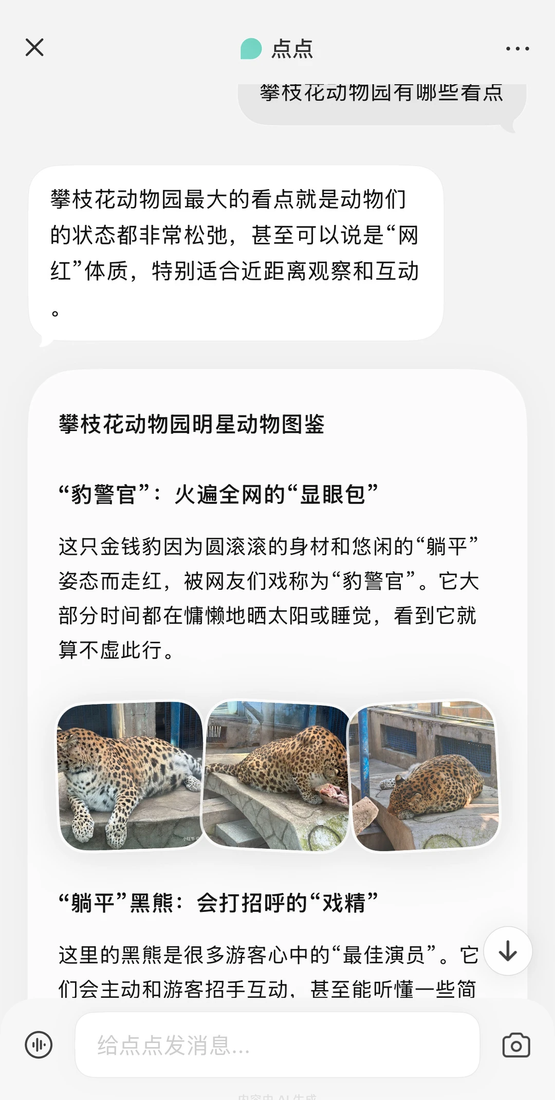 这也是我去攀枝花动物园前使用AI点点给我推荐的必打卡看点,除了旅行,日常生活中遇到问题,输入疑问,也能得到答案,不用麻烦自己一篇一篇找攻略了。