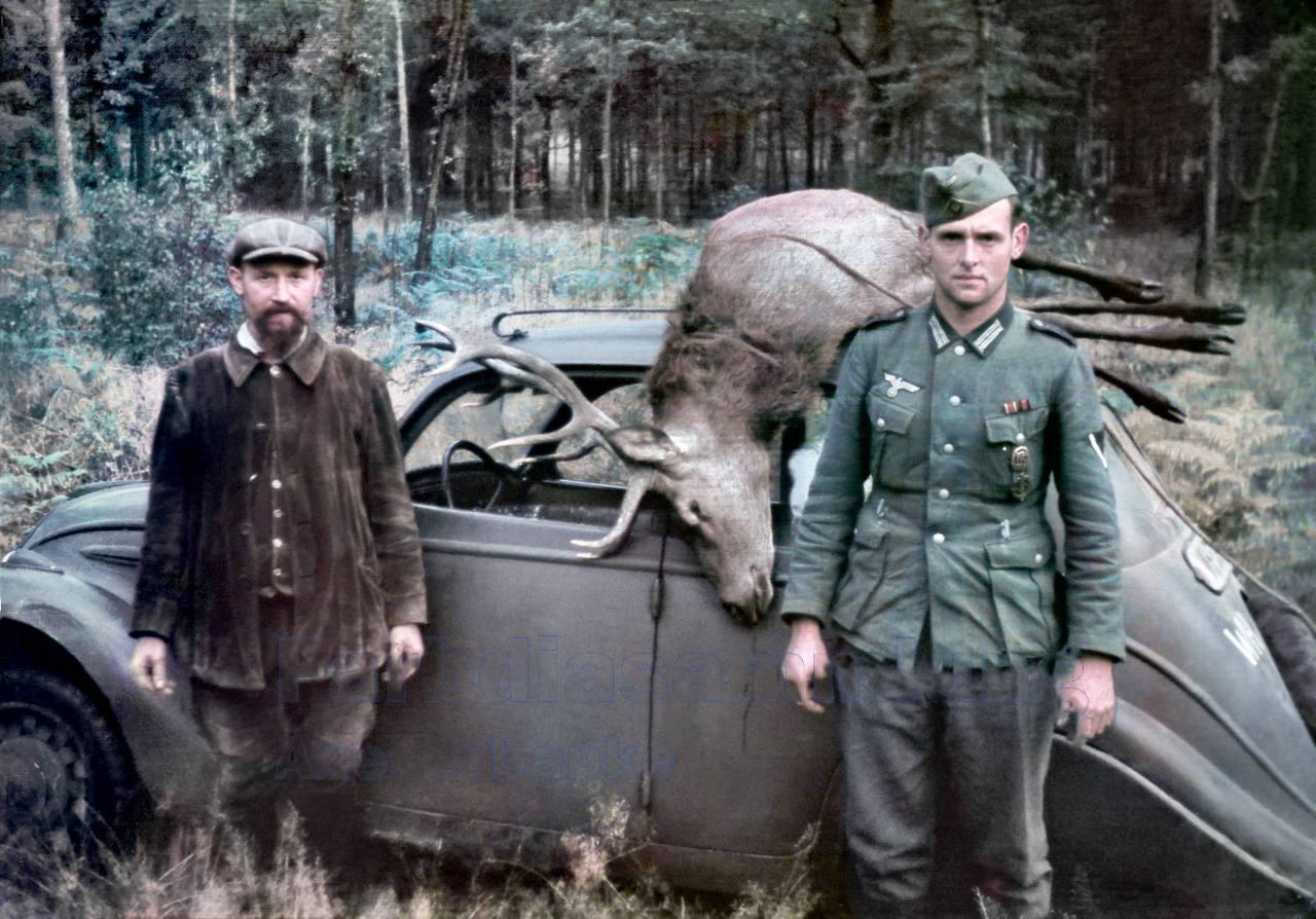 一些罕见的照片,照片中,隶属于第71步兵师第119步兵团的德意志国防军士兵在1940年法国沦陷后不久,于德国乡村展示他们猎获的鹿,照片中他们正站在一辆缴获的法国标致202汽车上。这张照片记录了东线战场到来前短暂的平静时光。 标致202汽车生产于1938年至1941年,是早期战争战利品的典型代表;德军缴获了超过10万辆,并经常将其改装为军用运输工具,这凸显了入侵后德军迅速调整后勤保障的能力。 这幅1940年的景象与该师的命运形成了鲜明的对比。在1942年至1943年的斯大林格勒战役中,第71步兵师被包围并几乎全军覆没,据德军官方记录,该师损失超过1.6万人。