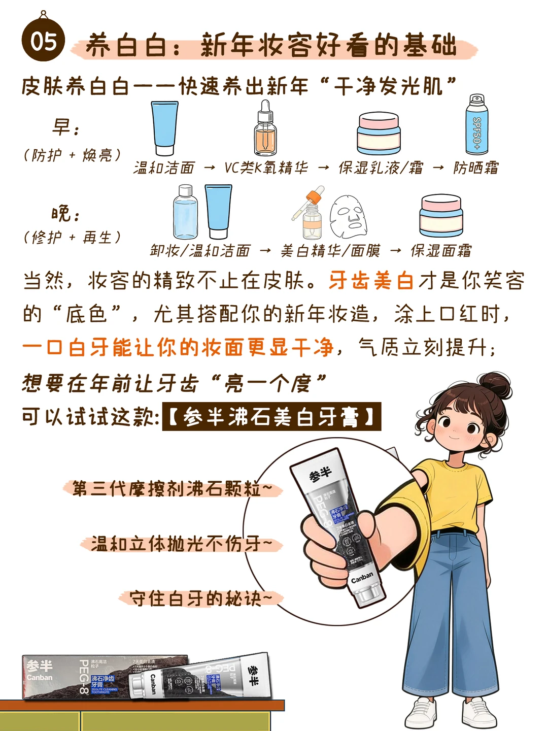 05.养白白:快速养出新年“干净发光肌”,透亮的皮肤底子以及一口白牙才是妆容高级感的关键;