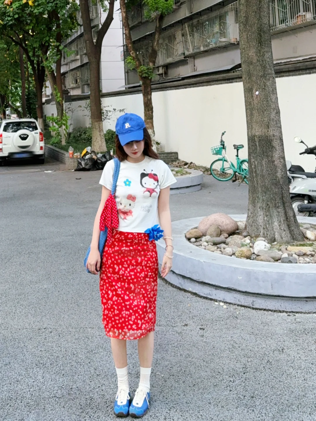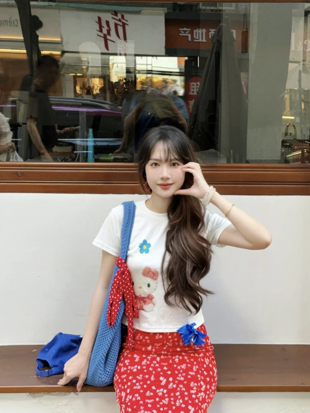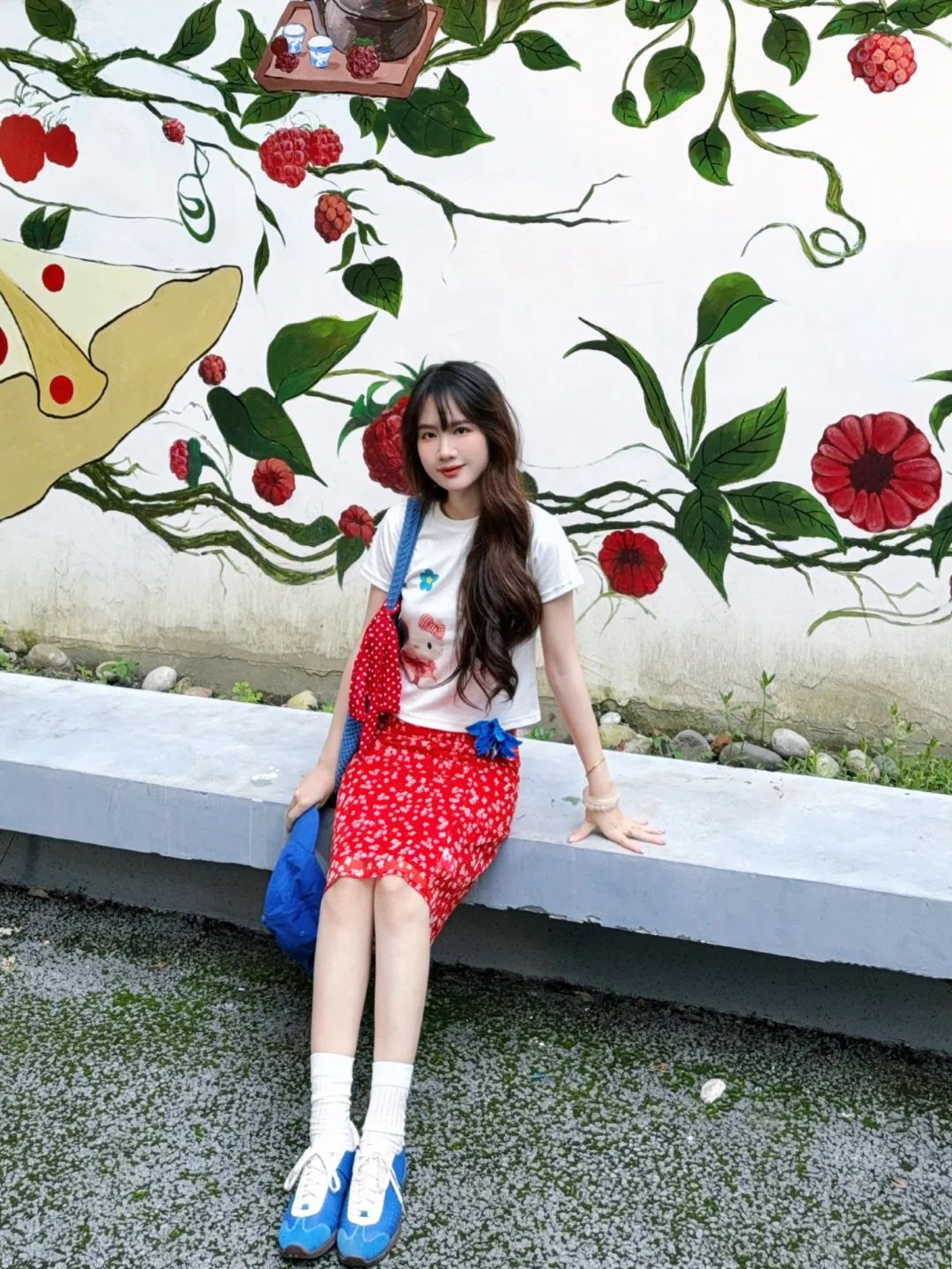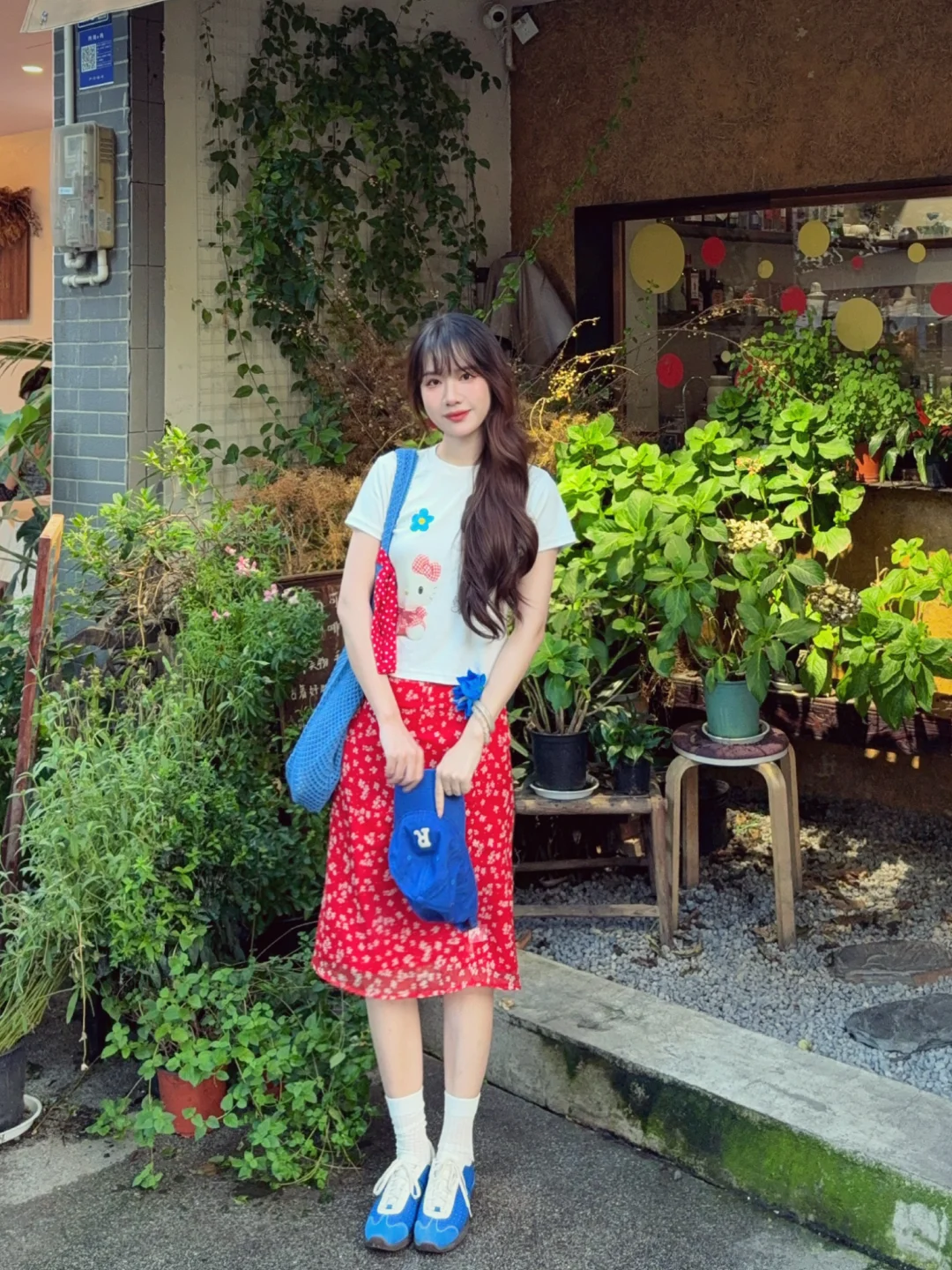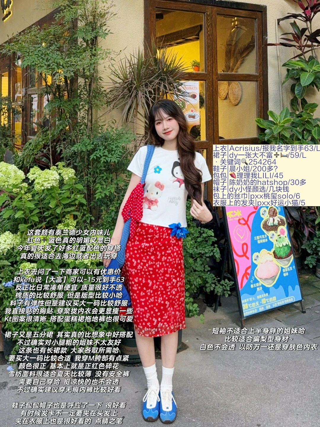 168/106 又是一套红色➕蓝色的夏日海边穿搭 今年真的美美拿捏了泰兰德少女的配色哈哈哈 宝蓝色➕大红色真的明媚又显白!! 不喜欢搭配五分裙的姐妹 可以换成同款长裙 也是不错的 或者搭配红色格子裤或者蓝色长裙 这个短袖想要搭配得比较日常也是ok的 原牛色或者黑色蓝色的拖地裤也好看 配饰选择红色或者蓝色就行~