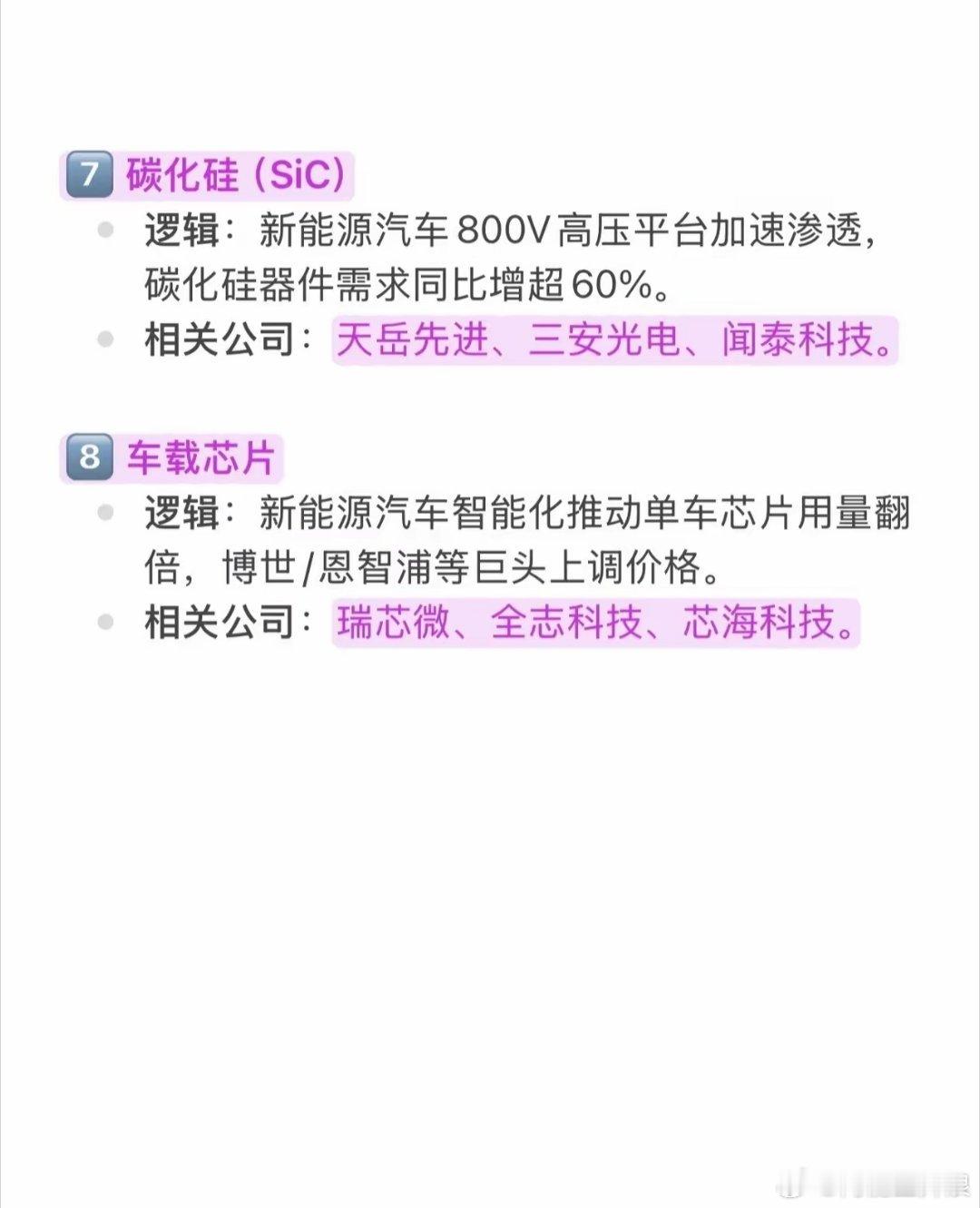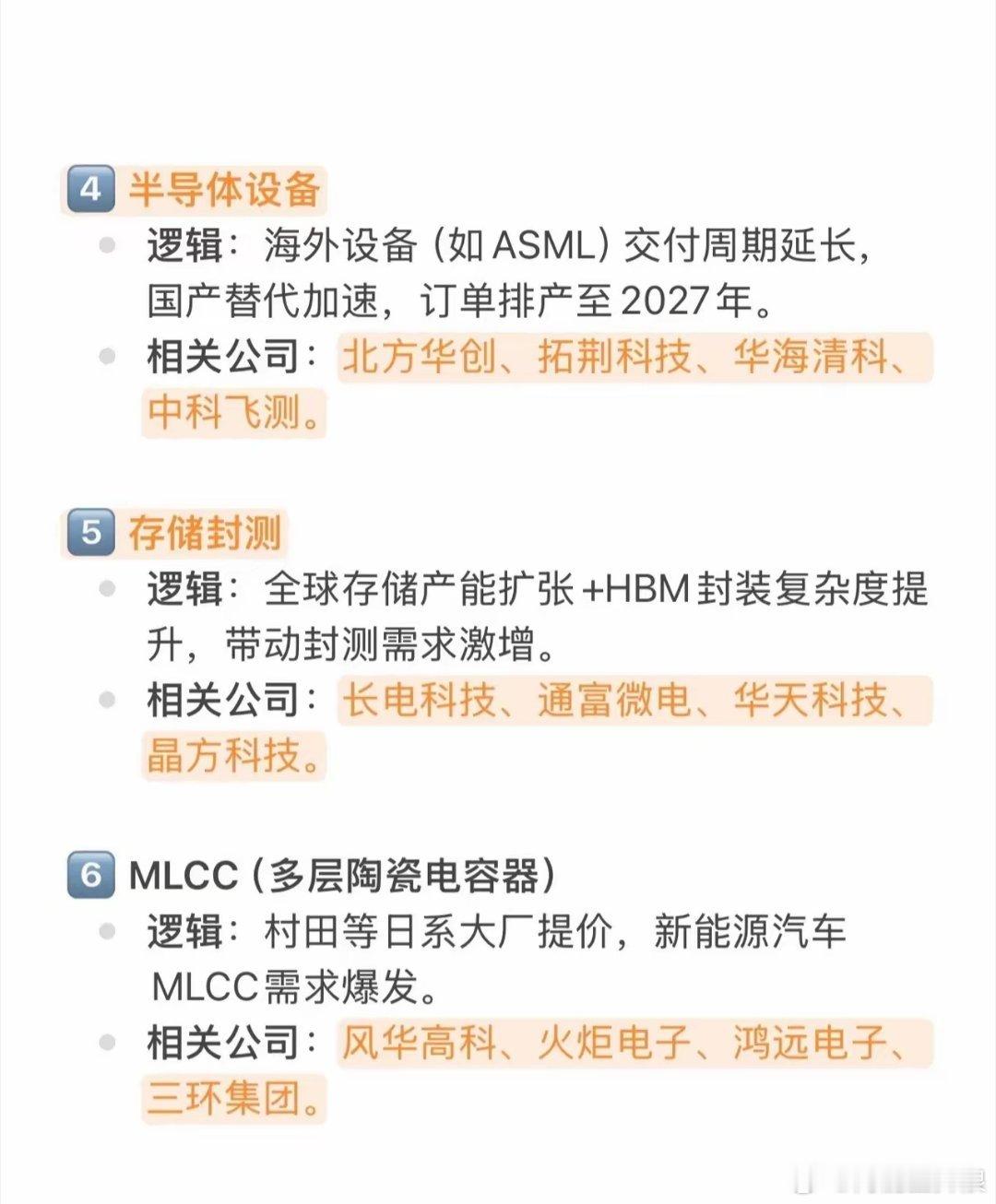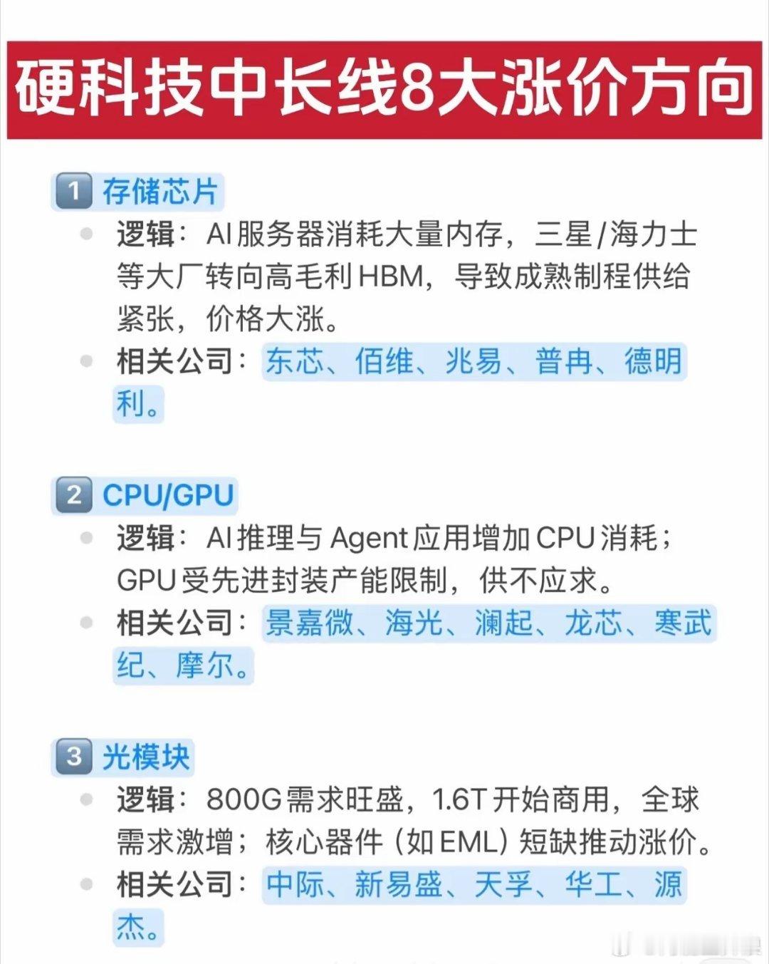 硬科技中长线8大涨价主线:核心逻辑+标的梳理硬科技赛道中长线迎来八大涨价核心方向,整体覆盖存储、算力、光通信、半导体设备/封测、被动元件、新能源功率器件、车载芯片等核心领域,核心驱动均围绕AI/新能源需求爆发与供给端约束(产能转移、核心器件短缺、国产替代加速)双重逻辑,各方向核心信息如下:存储芯片:AI服务器推高内存需求,三星、海力士等头部企业转产高毛利HBM,成熟制程存储芯片供应紧缺,价格大幅上涨;相关标的:东芯、佰维、兆易、普冉、德明利。CPU/GPU:AI推理、Agent应用拉升CPU消耗,GPU受先进封装产能限制陷入供不应求;相关标的:景嘉微、海光、澜起、龙芯、寒武纪、摩尔。光模块:800G需求高企、1.6T正式商用,全球需求激增,EML等核心器件短缺进一步推涨价格;相关标的:中际、新易盛、天孚、华工、源杰。半导体设备:ASML等海外设备交付周期大幅延长,国产替代进程加速,行业订单排产已至2027年;相关标的:北方华创、拓荆科技、华海清科、中科飞测。存储封测:全球存储产能扩张叠加HBM封装复杂度提升,行业封测需求迎来激增;相关标的:长电科技、通富微电、华天科技、晶方科技。MLCC(多层陶瓷电容器):村田等日系大厂官宣提价,新能源汽车领域MLCC需求迎来爆发式增长;相关标的:风华高科、火炬电子、鸿远电子、三环集团。碳化硅 (SiC):新能源汽车800V高压平台渗透速度加快,碳化硅器件需求同比增幅超60%;相关标的:天岳先进、三安光电、闻泰科技。车载芯片:新能源汽车智能化推动单车芯片用量翻倍,博世、恩智浦等国际巨头上调产品价格;相关标的:瑞芯微、全志科技、芯海科技