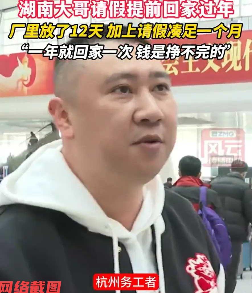 浙江杭州有男子提前请假回湖南老家过年。 当男子在火车站接受采访时说到自己的心思,自己打工的地方只放假十二天,他开始和老板请假凑满在家一个月,毕竟对他来说只有过年回家一次,平常只能在外打工,根本没有机会回家,家里孩子还是老人在帮忙看管,不管如何过年回家肯定是需要,男子最终坦言,这钱永远挣不完。 众人感喟在外打工的辛苦,只有过年是回家的目的,在这无法扭转的生活里看到众人心里的共鸣,过年回家成为了唯一的所求欲望,在自己的生活人生路途中必然看到的结果,这里有渴望,也有每个人心里强烈欲望带来的憧憬,如今年关要到,回家便是欣喜。 这里男子的理解也是所有在打工的人理解,意图只是简单却代表着无数人内心的期望,在外挣钱回家过年,一年一次的回家,定然要得到忙碌身影后的回归。