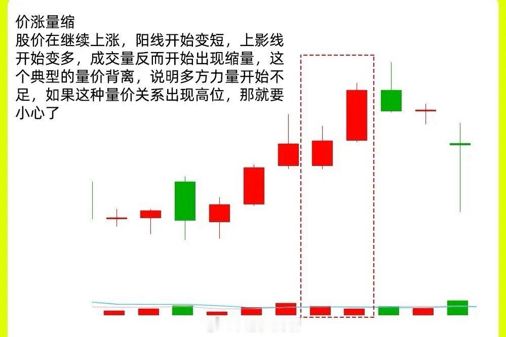 2. 价涨量缩股价继续上涨,但阳线变短、上影线增多,成交量却在萎缩,这是典型的量价背离,意味着多方力量在减弱。如果出现在高位,就得格外警惕了。