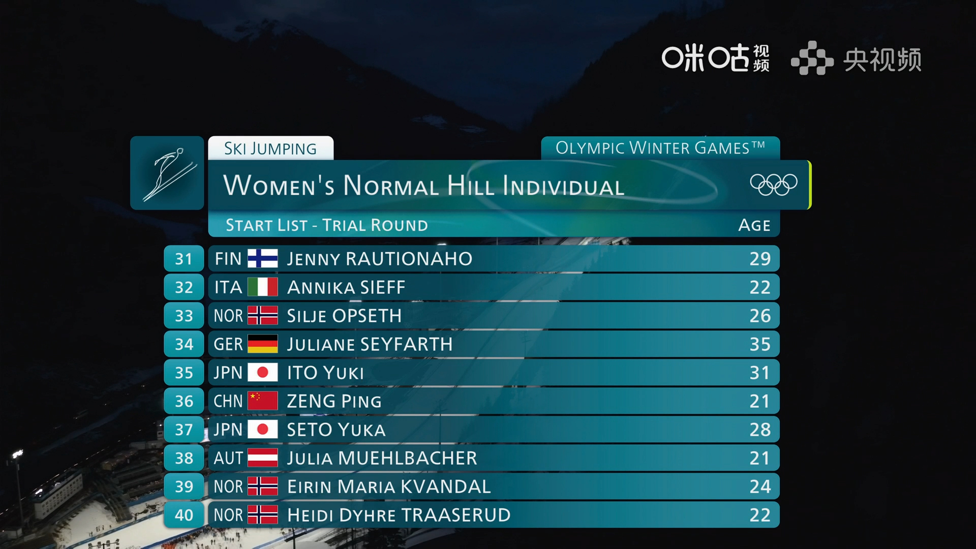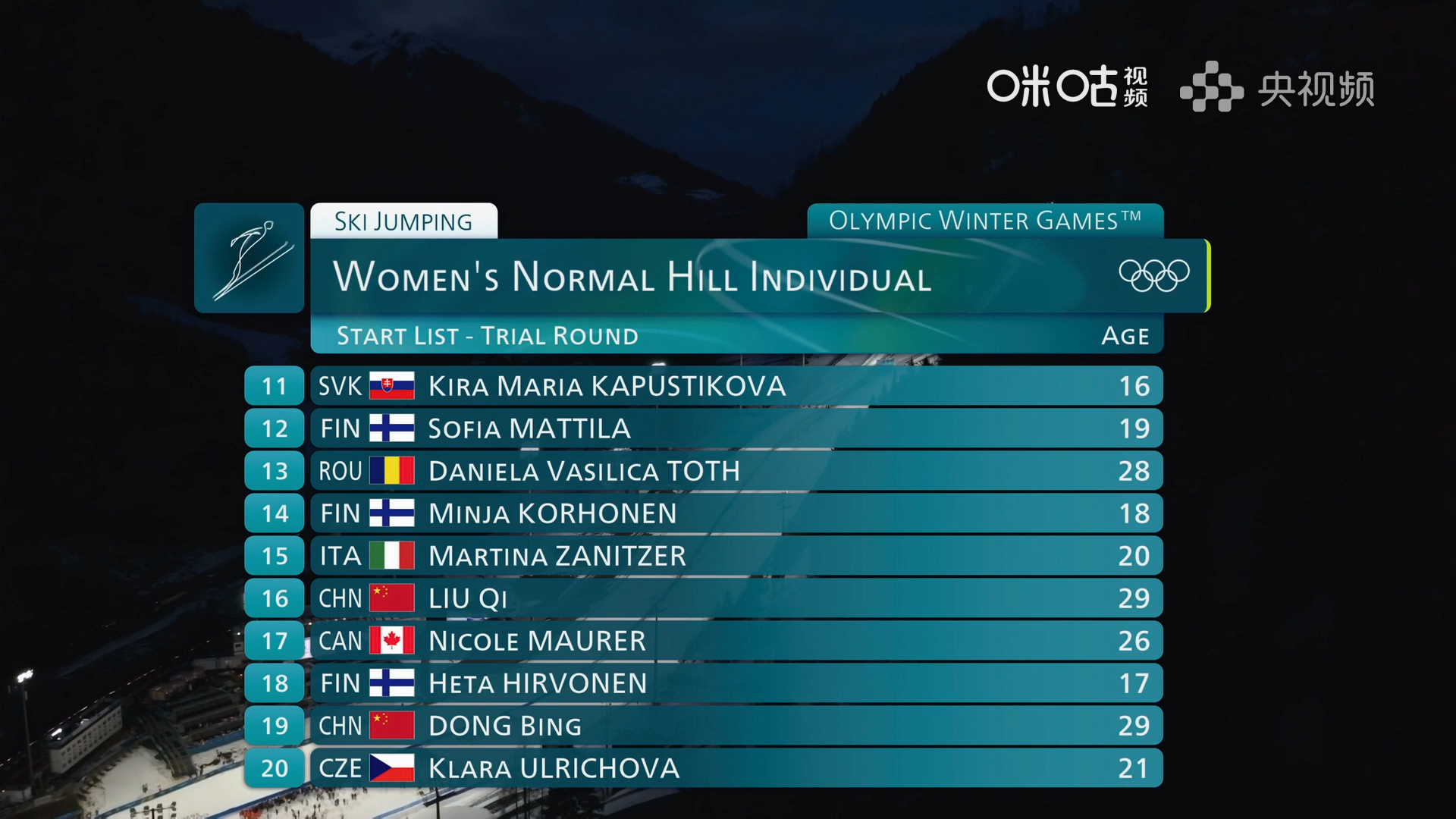跳台滑雪女子标准台第一轮,🇨🇳中国四名选手参赛,出发顺序分别是8号翁杨宁、16号刘奇、19号董冰、36号曾坪,来为中国姑娘们加油吧⛽️