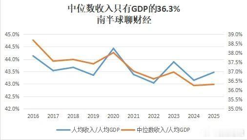 为什么在相同汇率背景下,人均GDP、人均收入所对应的日本年份会有所不同呢?因为中国的人均收入/人均GDP比值较低——不仅低于国际对比,也低于自己的上世纪80年代(当时占比超过60%,即人们从GDP蛋糕中分配得比现在多得多)。这张图我也列了中位数收入与GDP的比值,在讨论消费疲软(有效需求不足)时,大家应该更多关注这个数值的变动。