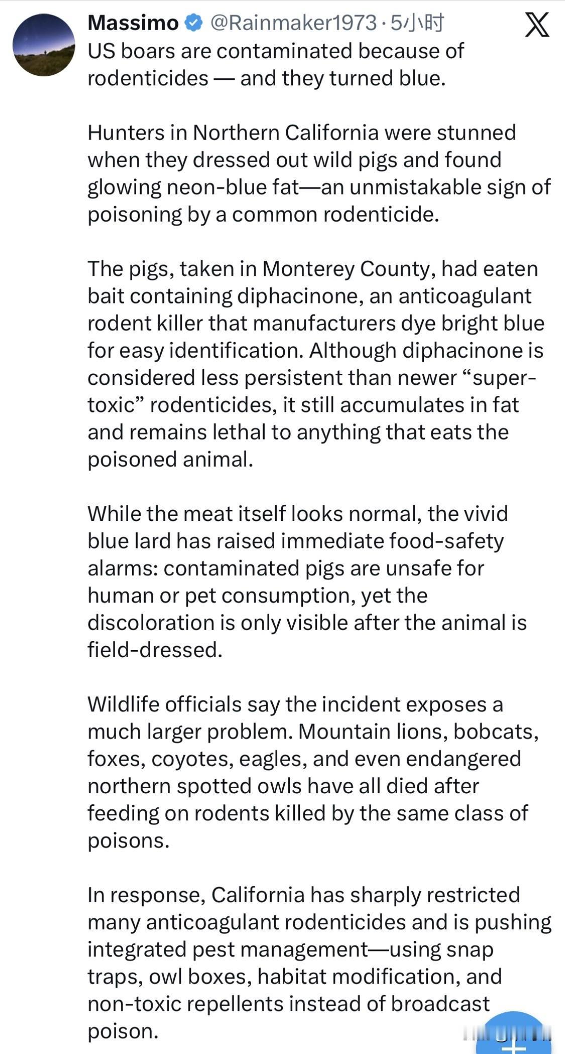 美国野猪因接触灭鼠剂而受到污染——它们都变成了蓝色。 北加州的猎人们在剥开野猪皮时,发现猪油中闪烁着霓虹蓝色的光芒,这无疑是中了常见灭鼠剂的毒。 这些在蒙特雷县捕获的猪误食了含有敌鼠酮的诱饵。敌鼠酮是一种抗凝血灭鼠剂,生产商为了便于识别,会将其染成亮蓝色。虽然敌鼠酮的持久性不如新型“超毒”灭鼠剂,但它仍然会在脂肪中积累,对任何食用中毒动物的生物都具有致命性。 虽然肉本身看起来很正常,但鲜亮的蓝色猪油立即引起了食品安全警报:受污染的猪对人类或宠物食用是不安全的,但这种变色只有在动物被宰杀后才能看到。 野生动物官员表示,这起事件暴露了一个更大的问题。美洲狮、短尾猫、狐狸、郊狼、鹰,甚至濒危的北方斑点猫头鹰,都因食用被同类毒药毒死的啮齿动物而死亡。 对此,加州已大幅限制了许多抗凝血灭鼠剂的使用,并大力推广综合虫害管理——使用捕鼠夹、猫头鹰巢箱、栖息地改造和无毒驱避剂,而不是大面积喷洒毒药。 当局现呼吁猎人和徒步旅行者立即报告在野生动物身上发现的任何颜色异常的脂肪或器官。这些发出蓝光的野猪生动地提醒人们,化学物质的扩散范围远远超出其预期目标,并且能够悄无声息地沿着食物链向上转移。
