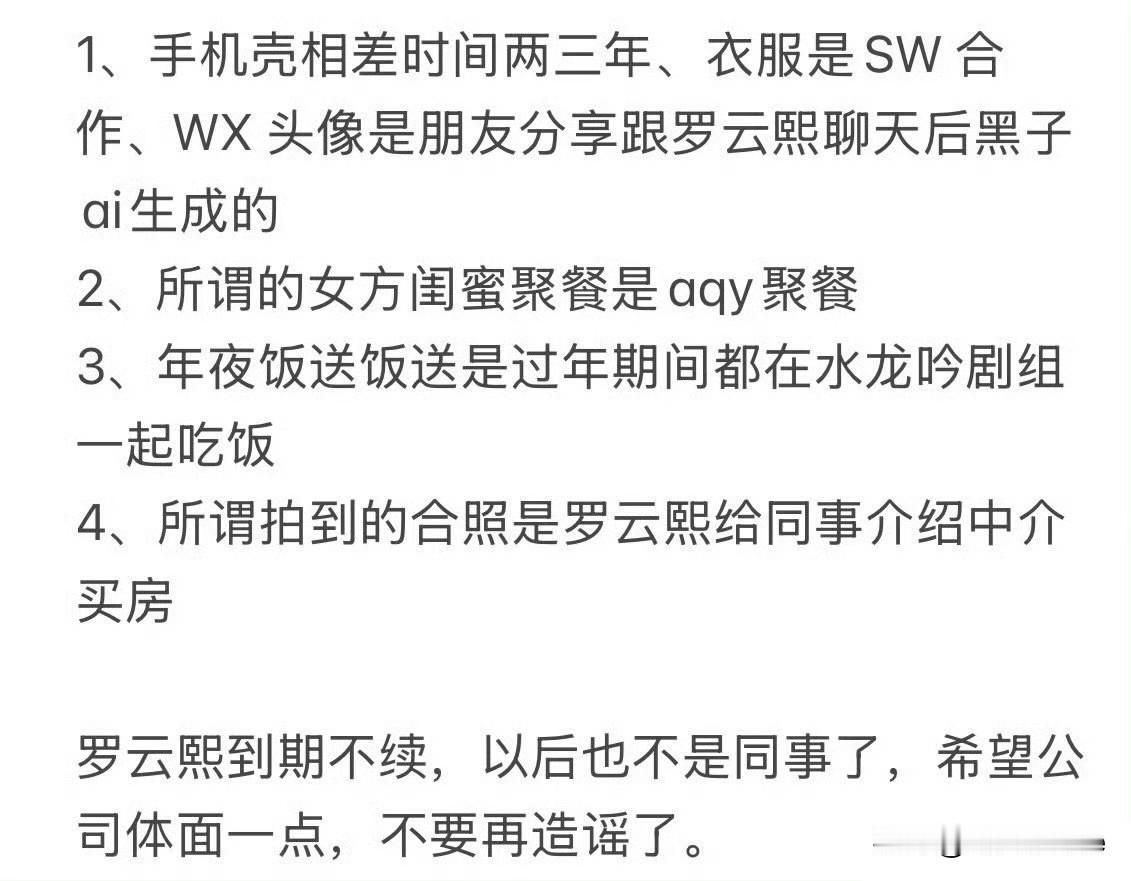 2月8日,罗云熙对接凌晨否认罗云熙与陈瑶恋情,就网友指出的两人恋爱细节,粉丝做了一一解释,总结就是两人只是普通同事关系,罗云熙离开公司后连同事关系都不是了,网友所谓的恋爱细节,不过是同事间的相处日常而已,所有的巧合都有时间差! 在我看来罗云熙陈瑶还挺搭的,他们恋情的事昨天就看到了,只是没分享出来,觉得不打扰就是对他们最好的祝福,看过粉丝解释后有些遗憾,不过也尊重两人,既然不是,那就祝他们早日找到属于自己的幸福吧! 罗云熙