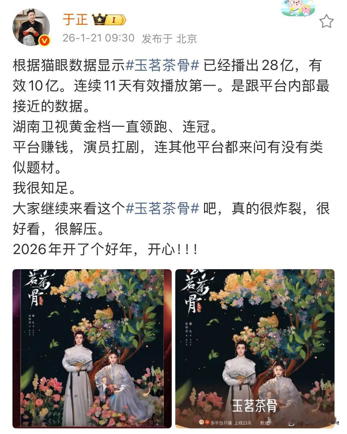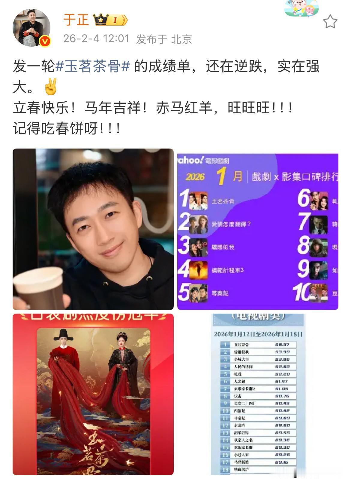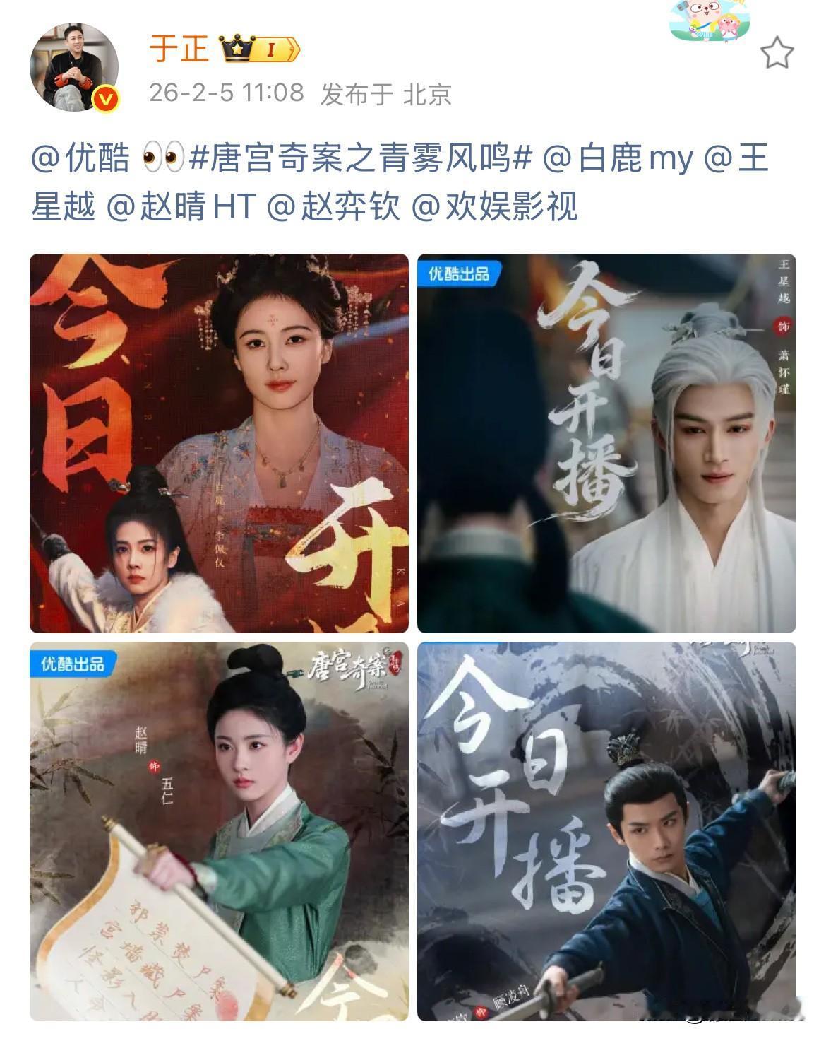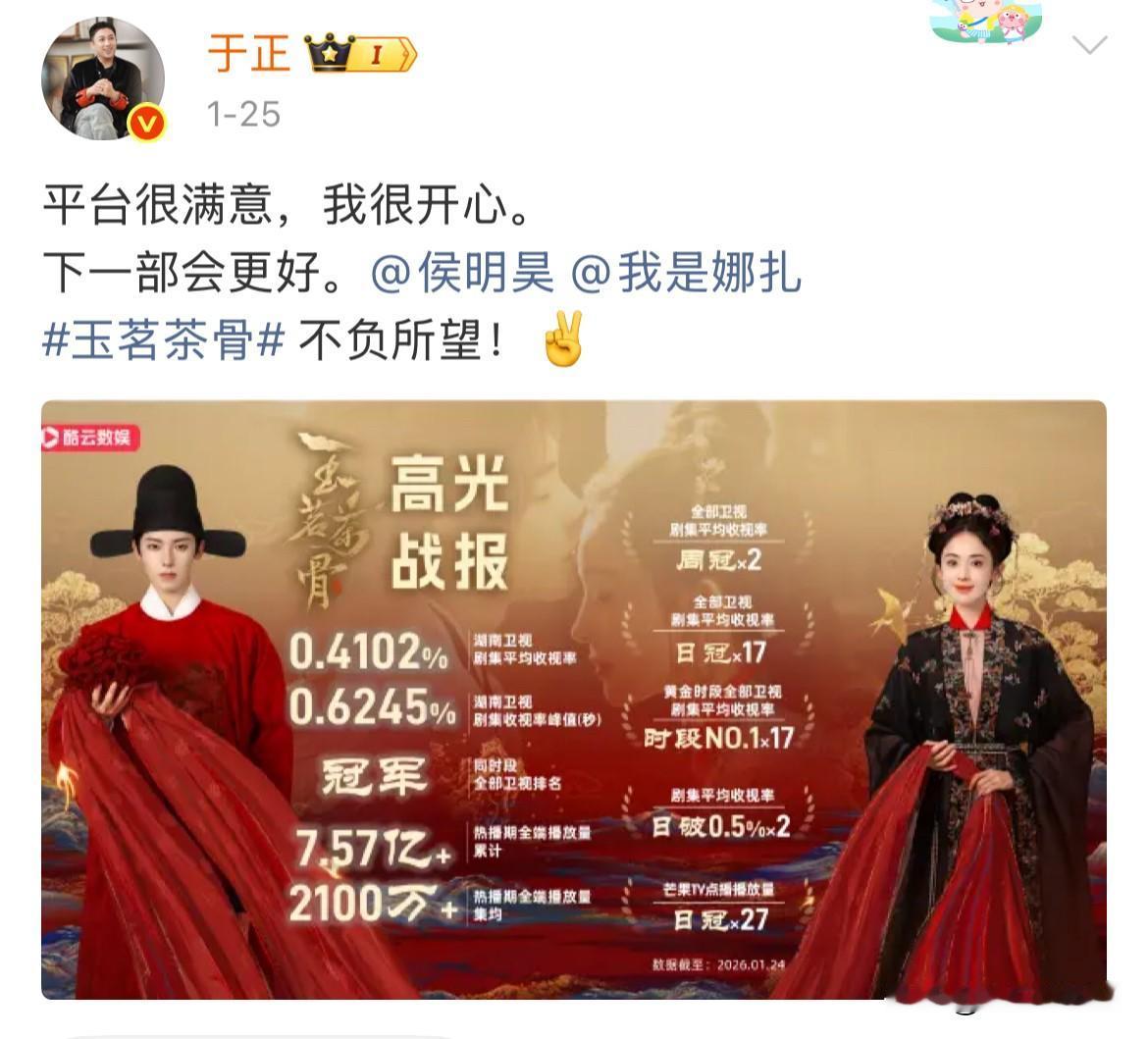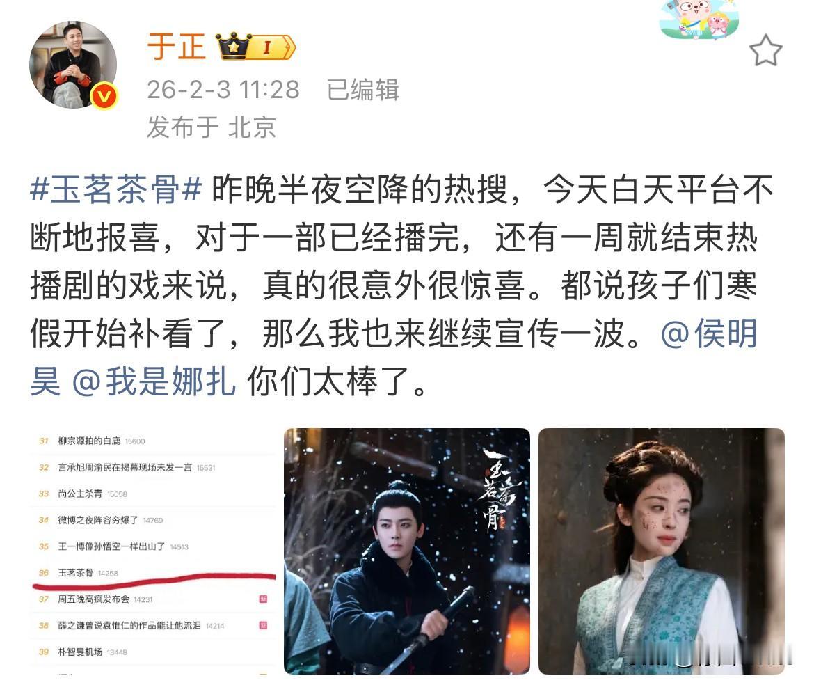 2月8日,于正对待内戏的不同态度 《玉茗茶骨》是真爱,《唐宫奇案》是意外 于正一家宣发都不给唐宫安排属实抠到家了,让人不由觉得好笑,他也是真能干出这事,玉茗茶骨配角一多半都是他的艺人,他天天安利天天发就不说了,安排的宣发也不少,轮到唐宫主演一多半都是他的艺人,就这么扔在哪里不管,指望鹿茸们投币往上冲,自己一毛不拔,也是算盘打的啪啪响! 通过于正对白鹿剧如此不上心抠门,非常怀疑,白鹿就是打算走了,于正没留住,索性就不管白鹿的剧了……不投入,全让鹿茸们为爱发电……于正