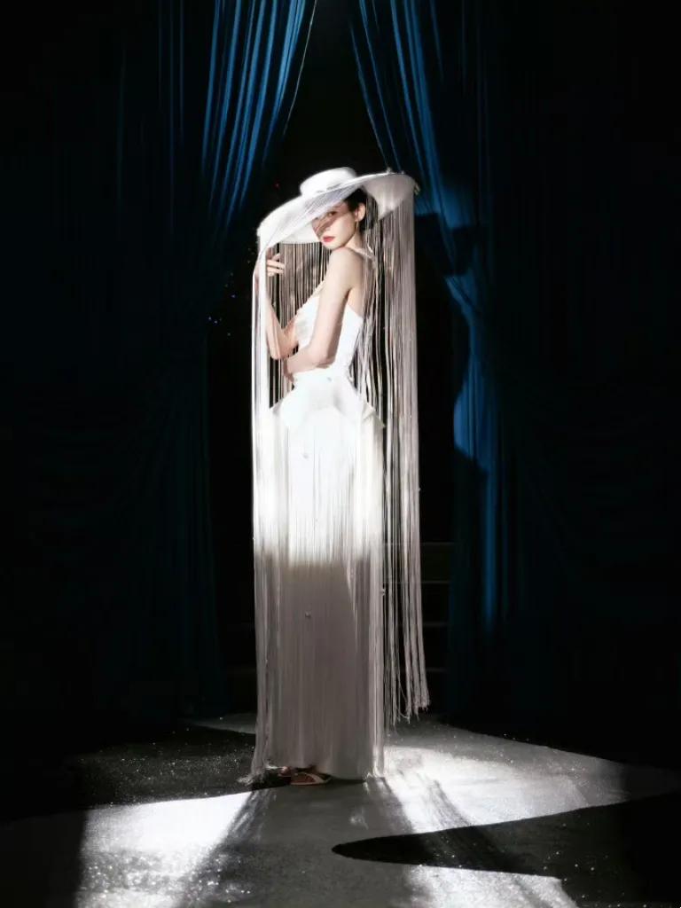 张艺凡超长流苏帽造型火了! 张艺凡在2026年微博之夜以一顶1.8米超长流苏帽搭配米白缎面礼裙的造型引爆全网,流苏帽外侧嵌有珍珠,转动时形成折角光影,模拟“月光瀑布”效果,强光下银灰色流苏与浅色礼服渐变融合,营造仙侠剧般的清冷神秘感。帽檐垂地设计需176cm以上的身高和芭蕾舞者的挺拔体态才能完美驾驭,一套造型实现“神秘缪斯”与“清冷天鹅”的双重惊艳。张艺凡超长流苏帽造型火了 张艺凡 张艺凡写真 张艺凡古装照