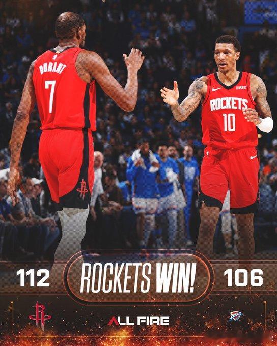 火箭队取得了一场重要胜利。尽管雷霆队缺少了MVP威廉姆斯,但火箭队急需这场胜利并成功拿下了比赛。