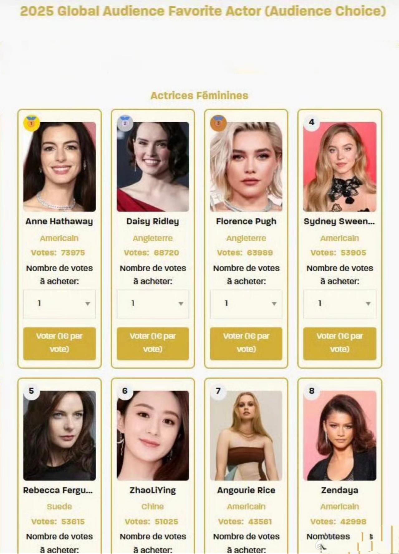 赵丽颖2025年全球票选:亚洲之光,闪耀世界 2025年欧洲世界电影节新增设的“全球观众最喜爱演员”奖,堪称一场全球影视盛宴,该奖项由全球观众投票产生,含金量十足。在这场激烈的角逐中,赵丽颖脱颖而出,位列全球女演员第6名,成为亚洲第一、国内唯一上榜的女演员,这一成绩令人瞩目。 2025年,赵丽颖虽作品数量不多,但质量上乘。在《在人间》中,她9分钟无台词表演,仅凭微表情便勾勒出角色弧光,被北电纳入教学案例;在《小城大事》里,她饰演的“认错不认命”的李秋萍,戳中了中外观众的心,海外二创播放量破千万。 赵丽颖用实力证明,非科班出身也能成为演技派。她对角色的精准把握和细腻演绎,赢得了全球观众的喜爱与认可。期待未来,她能继续带来更多精彩作品,在国际舞台上绽放更耀眼的光芒。
