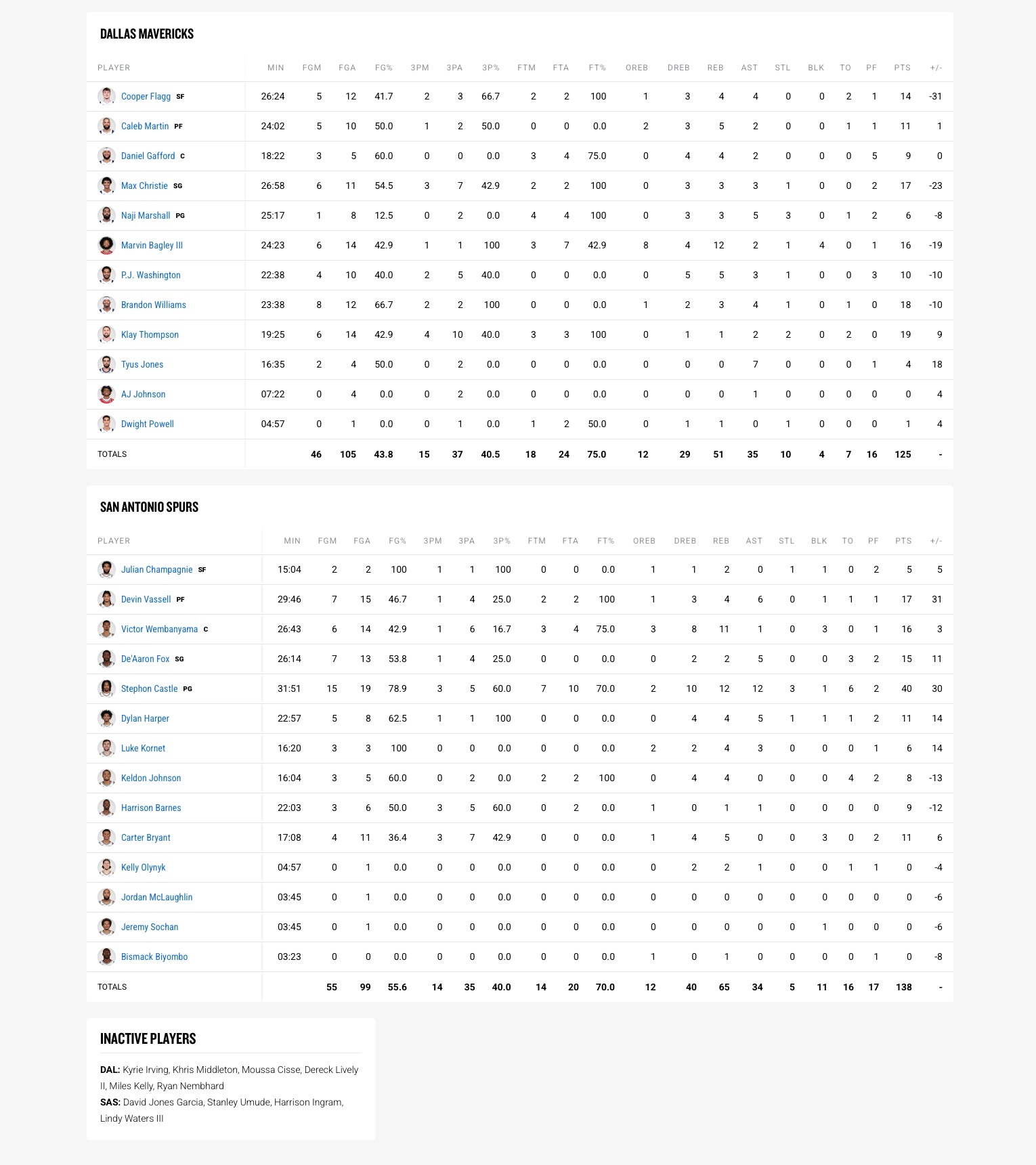 马刺(36-16):卡斯尔40分12板12助3断、瓦塞尔17分4板6助、文班亚马16分11板1助3帽、福克斯15分2板5助、布莱恩特11分5板3帽、哈珀11分4板5助、巴恩斯9分1板1助、凯尔登8分4板、科内特6分4板3助、尚帕尼5分2板、奥利尼克2板1助、比永博1板