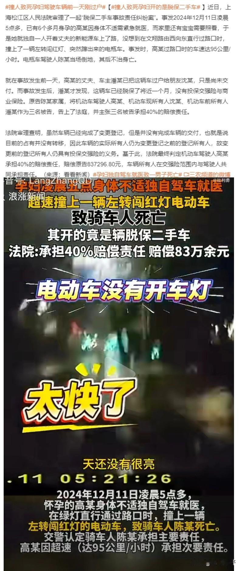 上海松江一起交通事故判决引发关注。一名怀孕6个月的孕妇凌晨因身体不适,独自驾车前往医院,在绿灯直行状态下严重超速,与一名闯红灯且未开车灯的电动车骑手相撞,造成骑手不幸身亡。 经交警认定,骑手承担事故主要责任,孕妇承担次要责任。法院判决孕妇赔偿83.7万元。由于事故发生时车辆交强险已脱保,本应由保险公司承担的部分赔偿需由其个人全部承担。 此次事故中,双方均存在违反交通规则的行为:一方闯红灯,一方严重超速,最终酿成悲剧。特殊情况虽可理解,但交通安全意识与车辆保险合规绝不能忽视。 主要问题还是,凌晨5点多在城内行驶时速95,太快了!凌晨也是有人出来谋生存,工作的…虽然她很急,但也要注意安全,看清楚路面。