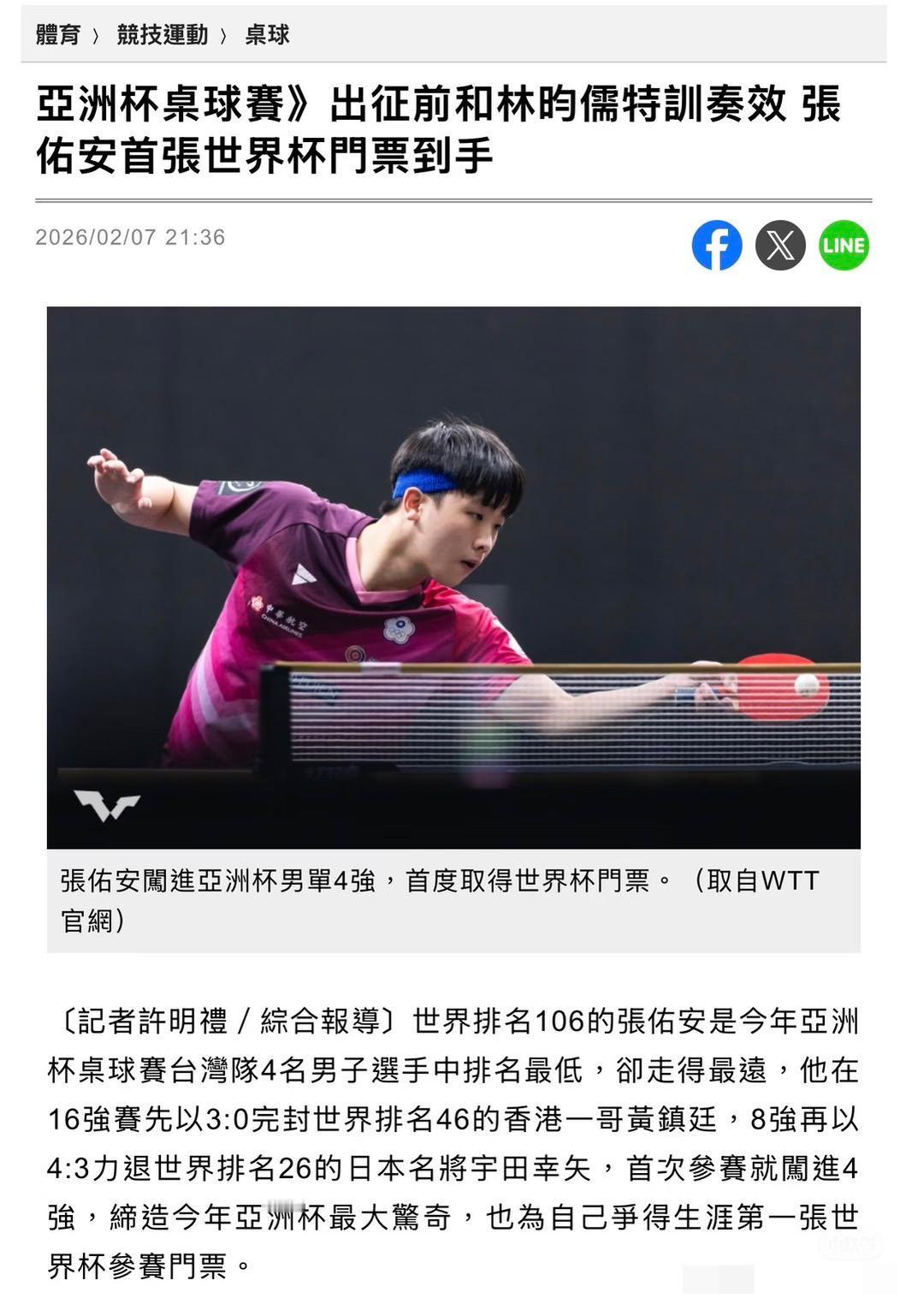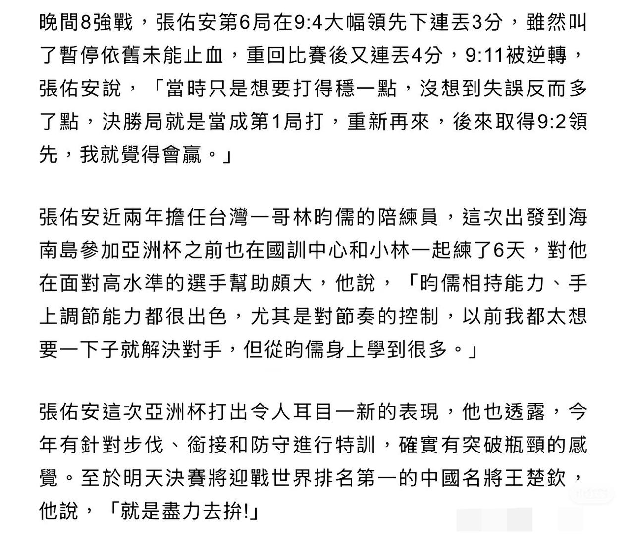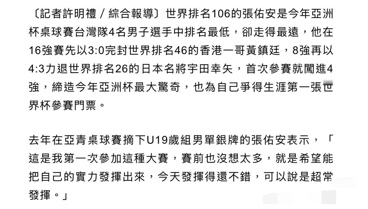 张佑安谈亚洲杯前给林昀儒陪练奏效——获得澳门世界杯门票感谢林昀儒 名师出高徒啊, 张佑安4:3宇田幸矢晋级海口亚洲杯 男单四强, 因此也获得世界杯参赛资格, 赛后采访中, 张佑安感谢大陆球迷为他加油, 更感谢林昀儒对自己 技战术上的帮助, 陪练林昀儒后, 涨球很多啊! 除了赛前特练, 张佑安这次亚洲杯的参赛名额 也是林昀儒退赛, 他递补上来的, 回去张佑安要请林昀儒吃饭啦!