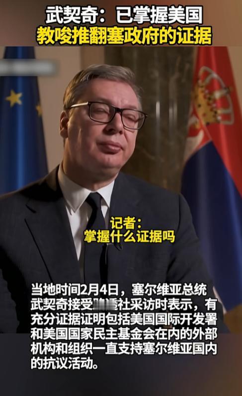 这操作太赤裸了,2月4日武契奇在接受采访时直接把话挑明了,他手里有实打实的证据,证明美国的两个机构,一直在塞尔维亚搞小动作,支持抗议活动,甚至教唆街头人员对抗政府,想把他赶下台。 而武契奇在采访里说得很实在,这些证据不是空口无凭,甚至能找到“昨天或十天前还在接受相关训练的人”。 这些人不是什么传统意义上的反对派,就是街头的普通人,被这些外部机构培训怎么对抗政府、怎么发动大规模抗议。 甚至他还略带调侃地说,这些机构砸进来的钱,反倒能对塞尔维亚GDP增长有点好处。 这其实不是武契奇第一次跟美国“撕破脸皮”,早在2025年,他就公开表示,自己挫败了一场由外部势力策划的“颜色革命”。 还直接点名了这两个美国机构,说他们投入了大约30亿欧元,就是想在塞尔维亚搞政权更迭,破坏塞尔维亚独立自主的外交政策。 其实武契奇这次的爆料,根本不是什么小事,一个国家的总统公开指控另一个大国的官方机构在自己国家搞颠覆活动,这本身就够劲爆了。 这背后藏着的,是塞尔维亚在大国博弈里,想保持独立自主有多难,武契奇这么硬气,既是给国内民众一个交代,也是给那些想插手塞尔维亚事务的外部势力一个明确的警告,别想在我的地盘上撒野。 但不管真相到底如何,这件事都给所有人提了个醒,那些所谓的“民主援助”,背后往往藏着不为人知的地缘政治算计。 一个国家的命运,终究要掌握在自己人民的手里,而不是外部势力的剧本里,武契奇这次敢把话挑明,就是要告诉全世界,塞尔维亚不吃这一套!