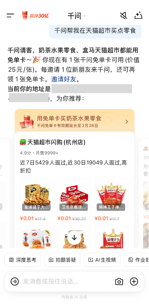 紧急通知:你的电子保姆已上线超市代购服务📢千问免单卡即日起覆盖天猫超市,闪购4小时达。就问还有什么是这个AI不能做的?千问免单可以点天猫超市了 千问免单卡可以买年货