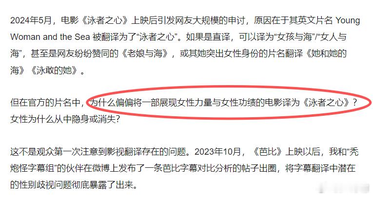 没开玩笑,这是芭比出来时的相关讨论她们认为,一个主体为女性的事件,就应该以女性命名,这叫叙事主体性。比如《芭比》这样,反面案例是谁呢?《泳者之心》,明明是一部女性游泳运动员的电影,却选择了“泳者”这样的中性词汇,完全没有突出女性的主体,这显然是一种压迫。合理的翻译,应该叫《女性与海》。