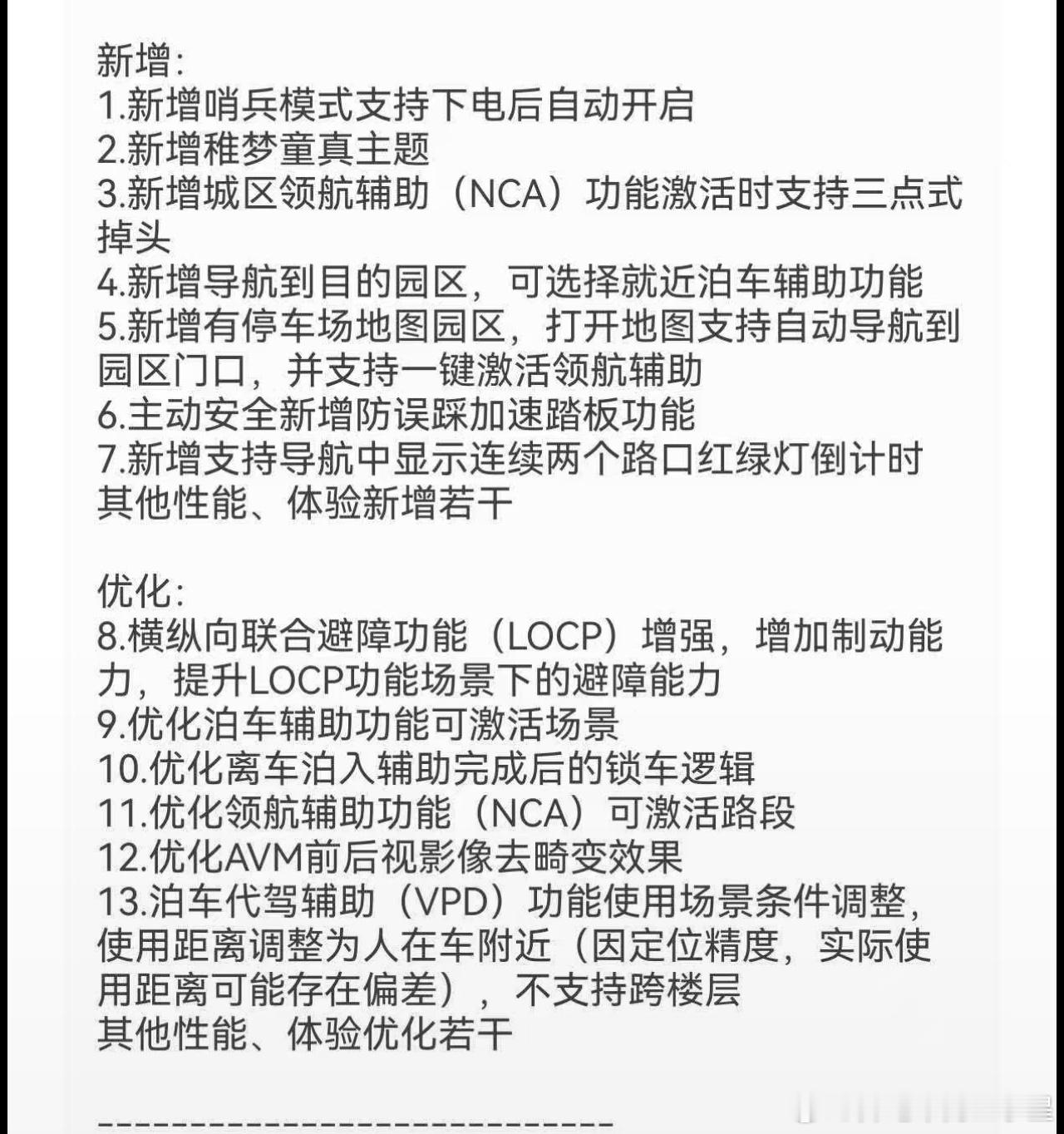 优化的功能也不少优化了路上紧急避障逻辑优化了泊车辅助场景优化了离车泊入锁车逻辑优化了AVM影像畸变