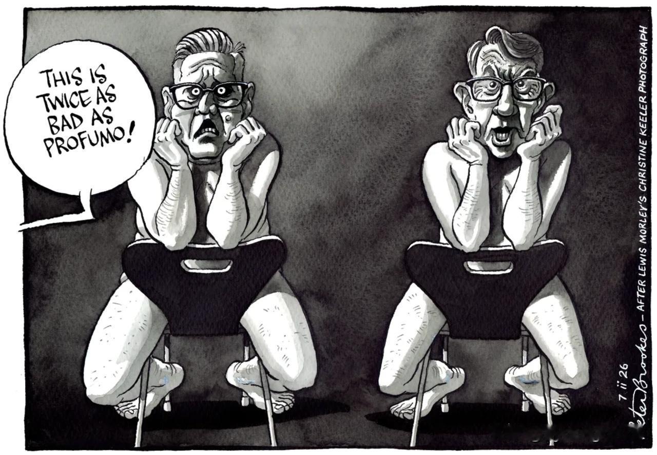 这是第一次看到《泰晤士报》的漫画家抄袭其他英国报纸的题材。昨天,《独立报》把基尔·斯塔默的处境和模特克里斯汀·基勒如出一辙,后者曾在上世纪60年代扳倒了权势滔天的英国大臣约翰·普罗富莫。 今天,《泰晤士报》也用了这张图,把曾经权倾一时的彼得·曼德尔森放在他旁边,并宣称“这比普罗富莫事件糟糕两倍”。 普罗富莫、基勒和俄国的间谍叶夫根尼·伊万诺夫的丑闻扳倒了一位大臣,但目前的丑闻很可能也会让首相下台!