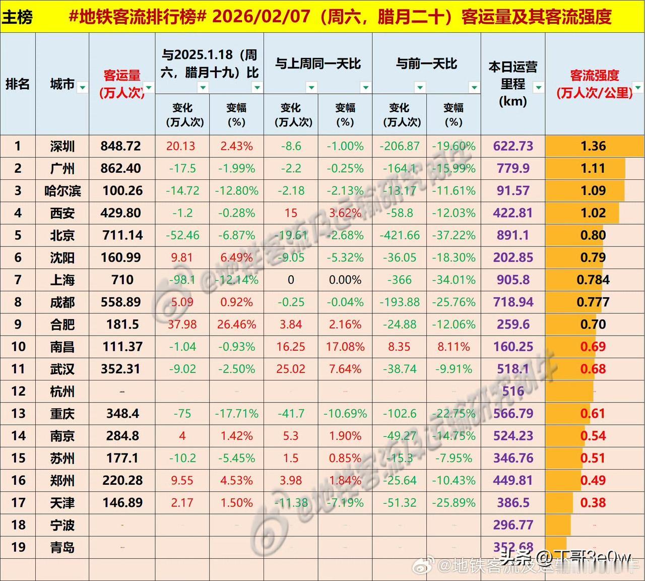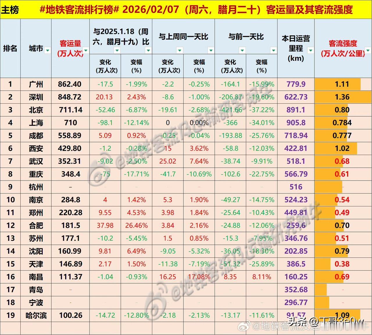 杭州地铁客流量294万人次昨日不敌武汉和重庆 爆料 身边事 地铁客流排行榜 中国地铁客流日报 客流 排行榜 周六 杭州 武汉 重庆 2026年2月7日 星期⑥ 全国重点城市轨道交通客流量排行榜: 广州:862.40万广州身边事 深圳:848.72万深圳身边事 北京:711.14万 上海:710.00万上海地铁 成都:558.89万 西安:429.80万西安身边事 武汉:352.31万武汉地铁 重庆:348.40万重庆身边事 杭州:284万+杭州爆料 南京:284.80万南京地铁 郑州:220.28万 合肥:181.50万合肥爆料 苏州:177.10万苏州身边事。 沈阳:160.99万沈阳地铁 天津:146.89万 南昌:111.37万南昌 青岛:100万+青岛爆料 宁波:100+万宁波身边事 哈尔滨:100.26万