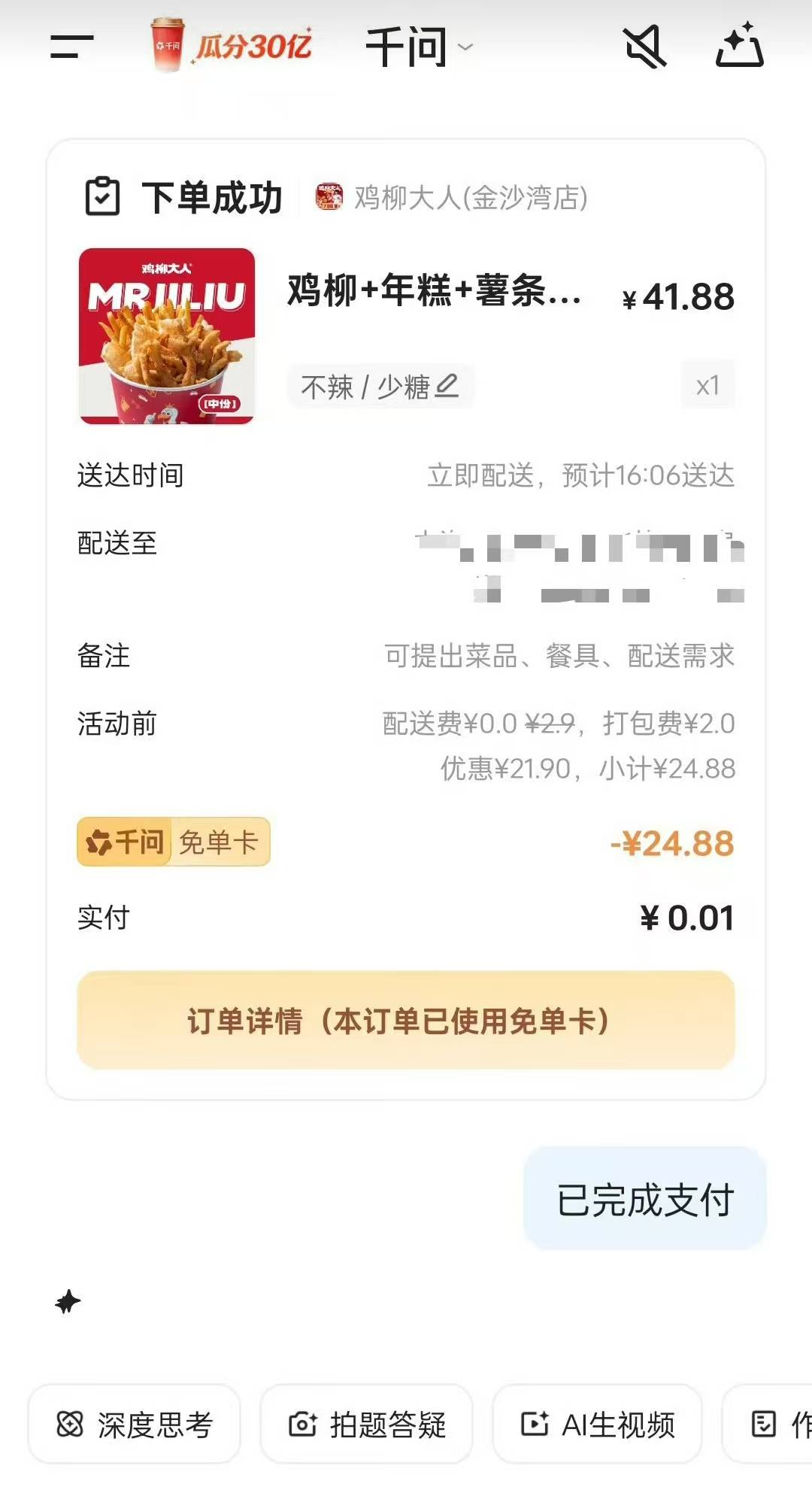 何同学谢谢AI请客跟着何同学把AI点外卖玩明白!我也用千问点了个外卖,用上免单卡实付居然只用一分钱!这完全就是给我打开了省钱的新思路啊!用它来点各种美食奶茶、天猫超市的日用百货都行,而且还贼划算呢!千问免单千问免单不止奶茶