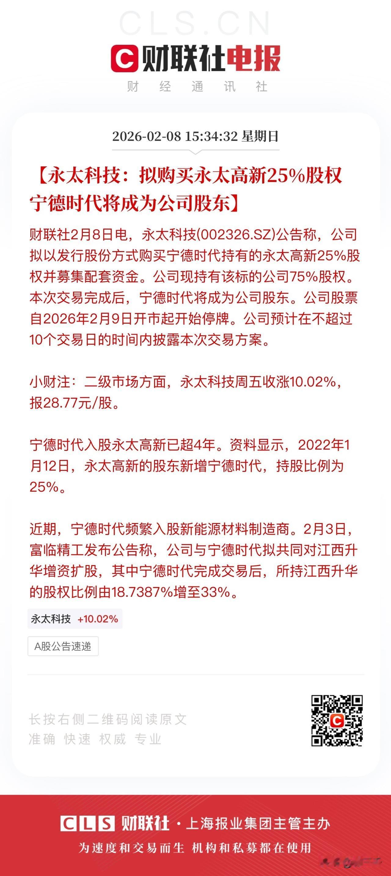 杉杉股份、永太科技周五的涨停原因: 居然都是并购重组! 安徽省国资委有望成为杉杉股份实控人, 这也许是最好的结局。 杉杉股份四季度是契合了电池高景气的, 先导智能、恩捷股份、湖南裕能都进行了呼应! 其实反而是永太科技, 按说高景气的六氟磷酸锂加持, 永太科技四季度业绩应该是大赚的, 结果还是负的, 可能和去库存或者压业绩谋并购有关。 当下氟化液应用开始扩展到Ai液冷应用, 这个市场是越来越大的, 加上全球低碳经济, 化工股变得稀缺, 三美股份、巨化股份都应证得很好。 近期启动的全球燃料龙头, 浙江龙盛也是一个逻辑! 包括巴斯夫供应链的业绩确定性, 坤彩科技等高辨识度标的…