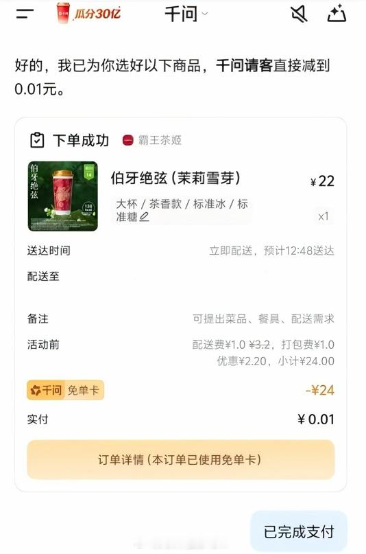 何同学谢谢AI请客 被何同学反向安利了千问,原来AI现在都能帮着点外卖请下午茶了!跟风试了下还领到免单卡,奶茶零食日用百货都能薅,主打一个科技干饭两不误谁能想到昔日聊天搭子,如今成了生活小帮手!