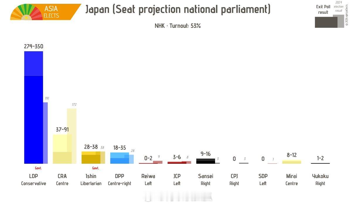 高市早苗破防了 出口民调显示,日本执政党自民党赢得众议院多数席位,甚至可能单独超过300席,主要反对党大败。