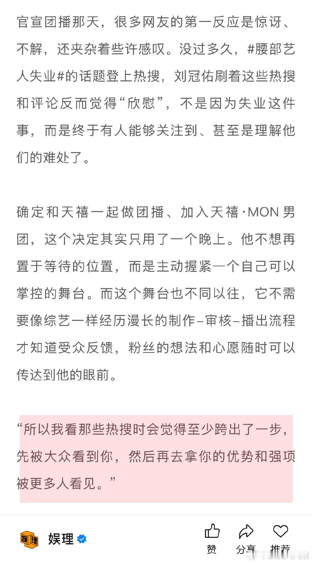 刘冠佑回应被说做团播可惜了 林超泽回应团播为了赚快钱 高强度的直播让出道七年第一次感受每天带妆,“皮肤也快扛不住了。”此外,在他看来,所谓“内娱没有舞台”的说法,本质上是对舞台的定义太狭隘。“团播就是舞台,为什么不能把它做成海外的打歌舞台?团播的发展一定会越来越精品化,我觉得这条赛道是未来可期的。” 刘冠佑林超泽谈爱豆做团播↓