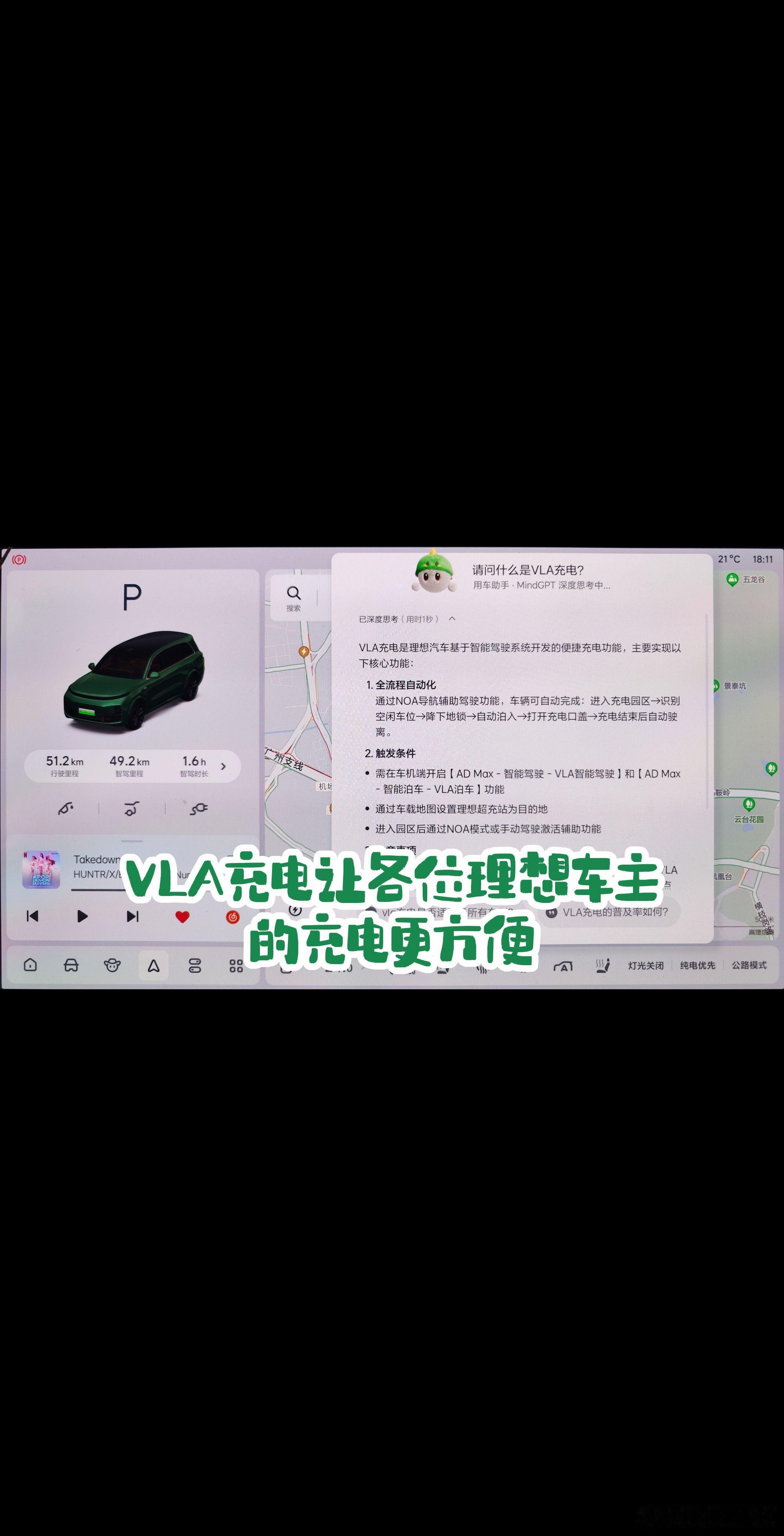 理想生活进行时VLA带我去充电 OTA8.2的推送升级真的是干货满满,除了万众期待的艺术相框和宠物模式之外,另外一个非常实用的VLA充电功能也是广受好评。当您在车里直接唤醒理想同学,并发起导航至有VLA充电功能的理想超充站后,车子会通过NOA智能驾驶直达充电车位,到达车位附近则会执行自动降地锁+自动泊入+自动打开充电口盖等一系列操作,您只需要拔枪插入即可启动充电,这样的功能真的非常实用。让VLA带您去充电,各位车友赶紧试试吧!