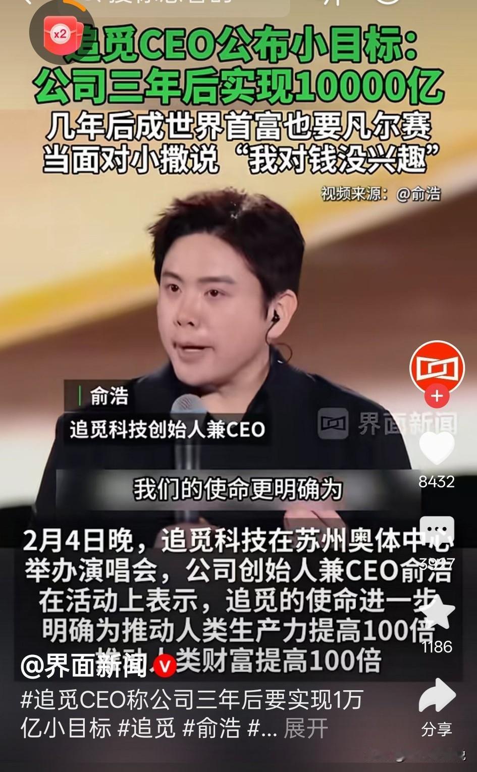 在公开场合第一个说对钱不感兴趣的是阿里公司的马云 如今在公开场合第二个说对钱不感兴趣的是追觅科技的俞浩 马云警告自身的努力,取得的成绩也是有目共睹,在世界上也是赫赫有名 而如今追觅科技的俞浩,不仅对钱不感兴趣,而且志向更加远大 要成为世界首富 如今世界第一的科技公司应该是特斯拉,世界第一首富是马斯科 希望追觅科技的俞浩能够早一天实现自己的梦想 让中国的科技公司享誉世界