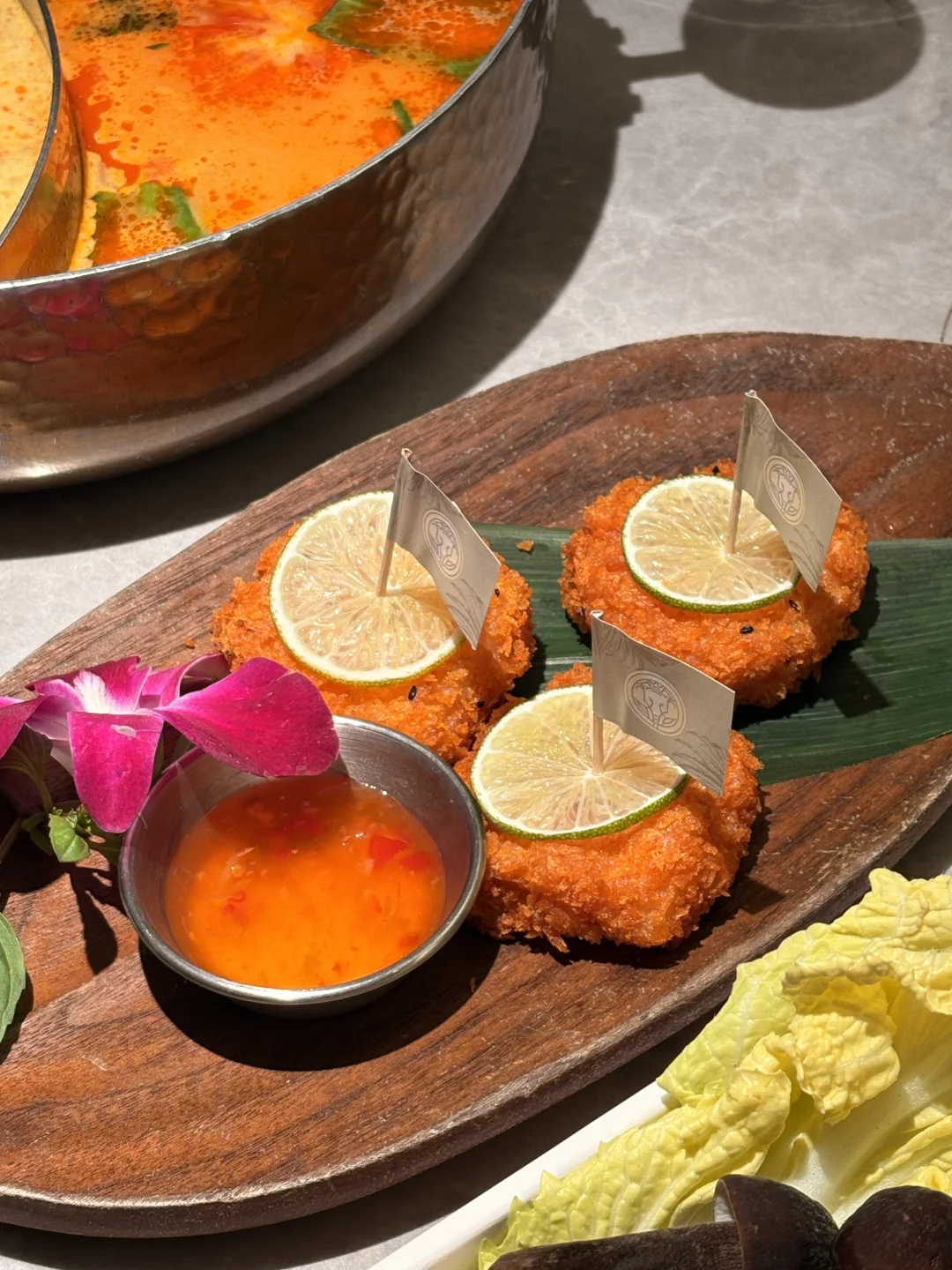 ✨ 必点泰式手打虾饼!外酥里嫩,蘸上甜辣酱一口一个,还有炭烤猪颈肉,香到舔手指~