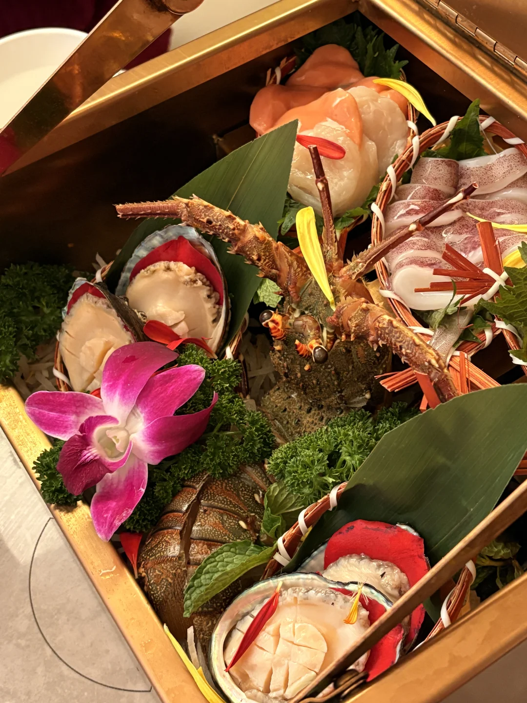 ✨ 那个节日宝藏海鲜手工金盒一打开直接惊艳!370g的青龙超大只,还有日本扇贝、鲜活鲍鱼仔,每一口都是新鲜到弹牙的鲜甜。