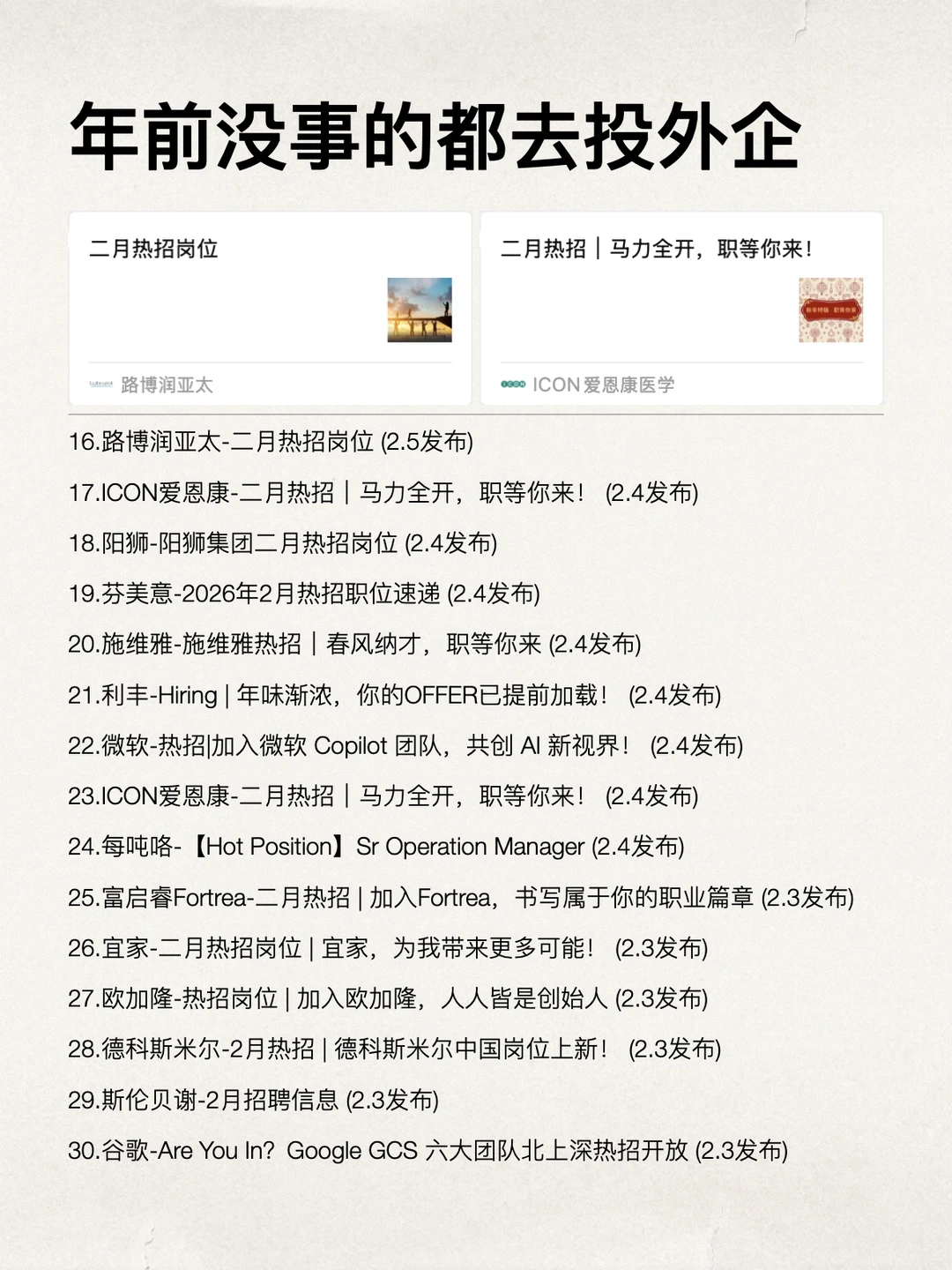 放假前大大小小的外企都来放hc了,更新了一下信息发现放岗的速度比上个月还快!估计都是想放假期间收一波简历 如果是想投外企的,最好就是盯着这种新放岗投,一般都是真实需求+投递反馈快,会更好拿offer wlb其实一直都是外企的代名词,所以想追求wlb的真的可以去试试,年假15天以上、无996、双休、灵活居家办公、女性友好...真的很香 坚持日更✊🏻,对外企感兴趣的欢迎常来看看