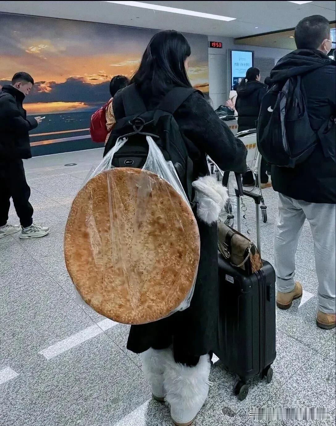 这个女生一看就知道是过日子的人。女生出远门,为了路上减少开支,从家里带了一张囊出来。这么大的一个馕,足够路上吃了,渴了喝点水。至少可以吃一天,比在路边上下饭馆省钱多了,现在一碗面也得10块钱到15块钱。 现在的女生出门带干粮的人不多了,一是感觉不方便,二感觉到不好意思,怕丢人。 该女生能这样带干粮出门,说明家风家训好,父母教的好。