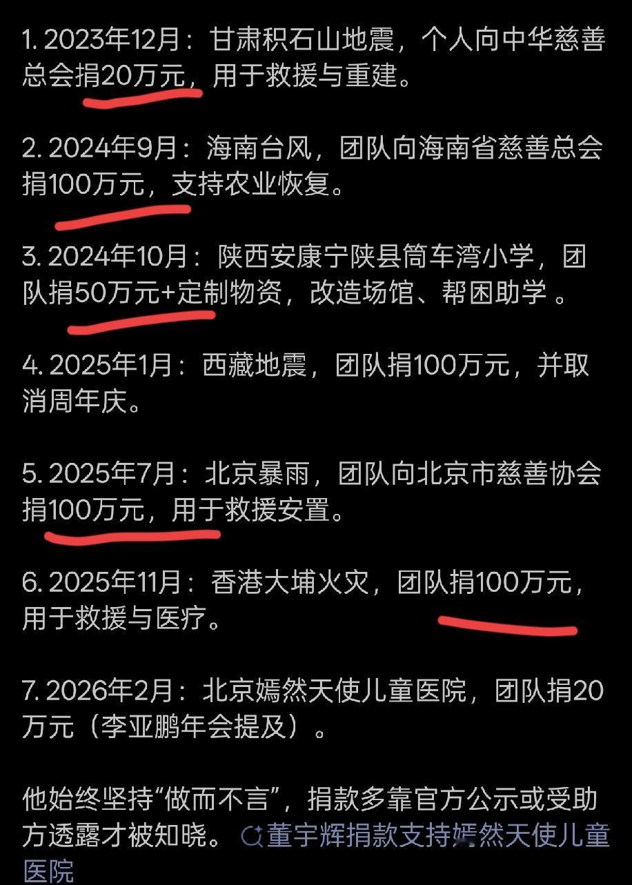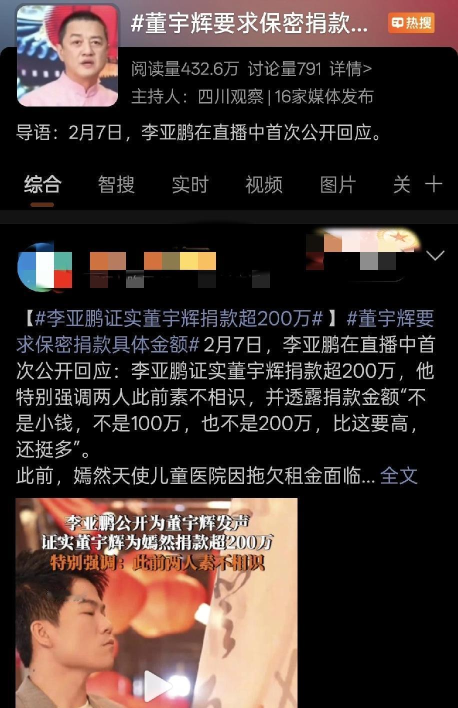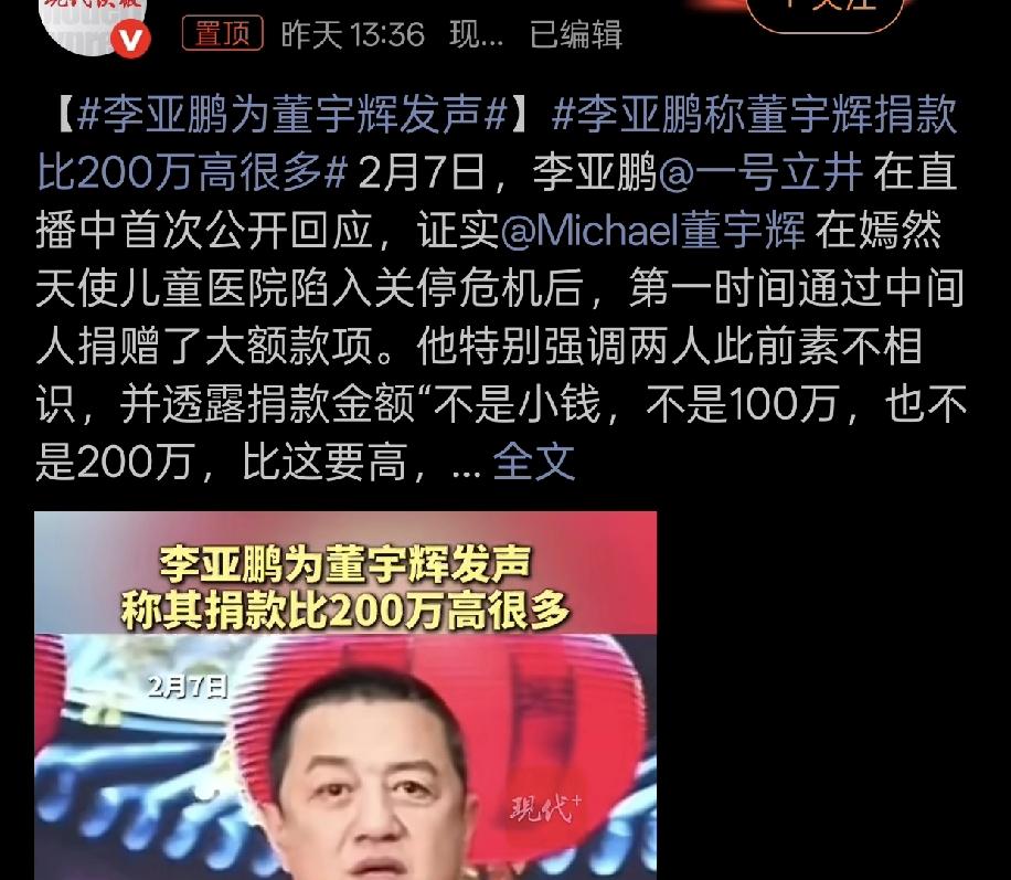 董宇辉和小杨哥的营销之路,有点相似。 大小杨当年因为虚假宣传,被杭州市监局罚款,后面通过两次巨额捐款,挽回了口碑形象。 一次是涿州暴雨,大小杨捐款2000万, 一次是甘肃地震,再次捐款1200万 比很多企业家都豪气慷慨。 这次董宇辉同样因为虚假宣传售卖黄油母鸡,形象口碑大跌。 正好遇到了李亚鹏医院事件,一下子捐出有史以来最大一笔善款金额。 然后“低调”地买了好几个热搜,通过李亚鹏之口广而告之。 这一招还是挺管用的,毕竟,捐款总归是值得称赞的。
