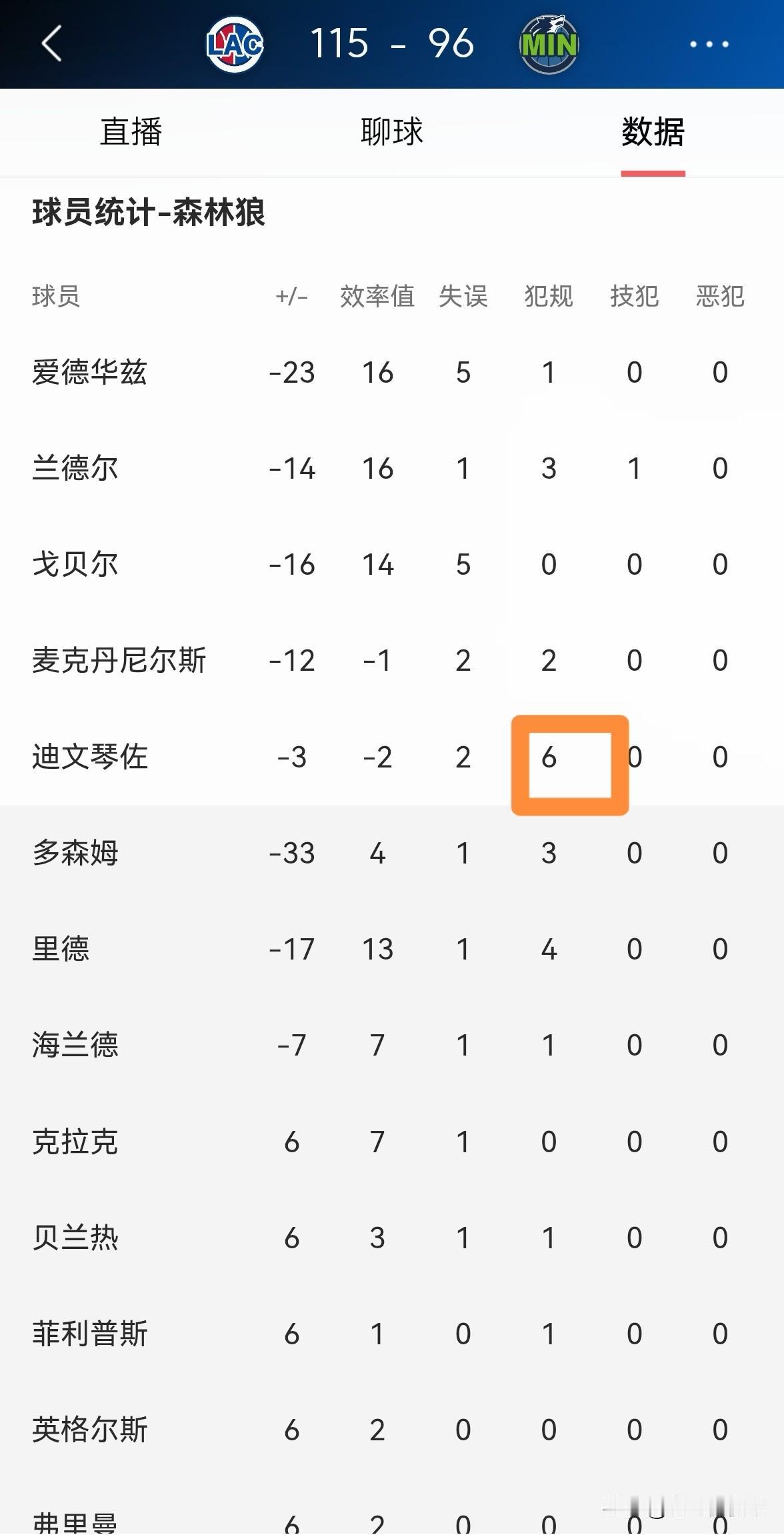 森林狼大将迪文岑佐真是出工不出力!在今天森林狼主场以96:115惨败于快船的比赛中,迪文岑佐首发出战23分钟,投篮3中0,其中罚球2中1仅仅得到可怜的1分,还有2次失误和6次犯规,他的场上正负值为-3。 实事求是的说,本场比赛迪文岑佐在攻防两端都显得斗志不足,他在场上给人一种无心恋战的感觉。 老实说,目前森林狼队内出现了严重的问题,球队的一些主力球员在场上都是出工不出力。