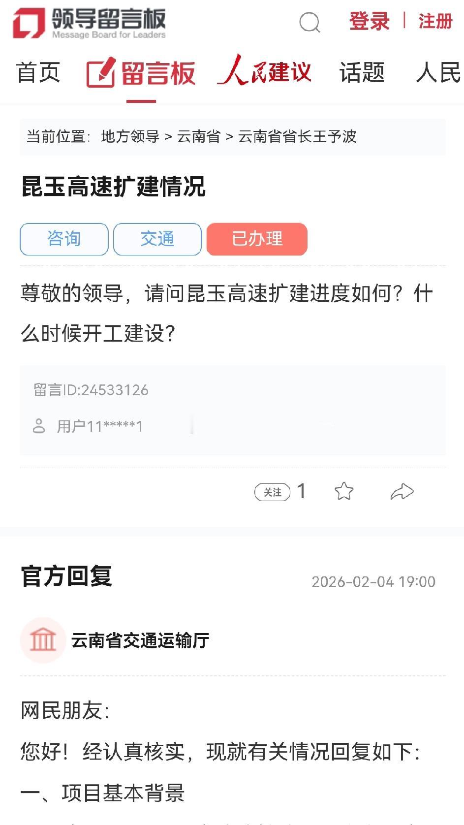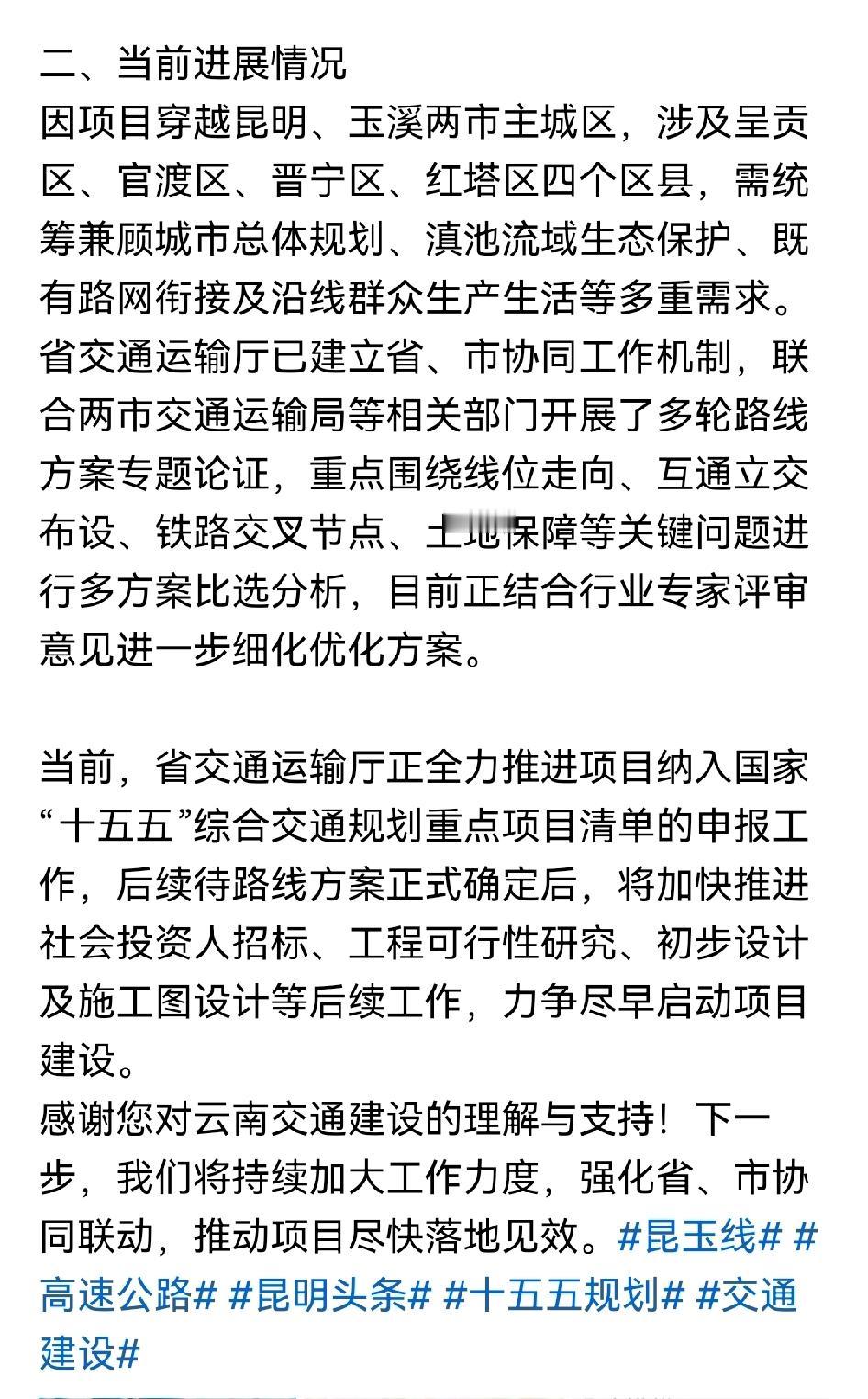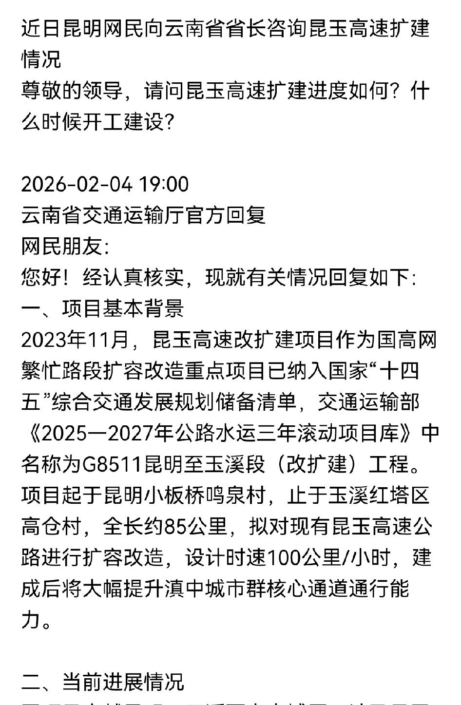 云南省交通运输厅详解昆玉高速改扩建工程最新动态。 昆玉高速扩建情况。近日,昆明网民向云南省省长咨询昆玉高速扩建相关情况。“尊敬的领导,请问昆玉高速扩建进度怎样?何时开工建设?” 2026年2月4日,云南省交通运输厅官方回复网民朋友:您好!经认真核查,现就有关情况回复如下。 一、项目基本背景。2023年11月,昆玉高速改扩建项目作为国高网繁忙路段扩容改造重点项目,已列入国家“十四五”综合交通发展规划储备清单。交通运输部2025 - 2027年公路水运三年滚动项目库中名称为G8511昆明至玉溪段工程。 项目起于昆明小板桥鸣泉村,止于玉溪红塔区高仓村,全长约85公里。拟对现有昆玉高速公路进行扩容改造,设计时速100公里/小时,建成后将显著提升滇中城市群核心通道通行能力。 二、当前进展情况。由于项目穿越昆明、玉溪两市主城区,涉及呈贡区、官渡区、晋宁区、红塔区四个区县,需统筹兼顾城市总体规划、滇池流域生态保护、既有路网衔接及沿线群众生产生活等多方面需求。 省交通运输厅已构建省、市协同工作机制,联合两市交通运输局等相关部门开展了多轮路线方案专题研讨,重点围绕线位走向、互通立交布设、铁路交叉节点、土地保障等关键问题进行多方案比选分析。目前正结合行业专家评审意见进一步细化完善方案。 当前,省交通运输厅正全力推进该项目纳入国家“十五五”综合交通规划重点项目清单的申报工作。后续待路线方案正式确定后,将加快推进社会投资人招标、工程可行性研究、初步设计及施工图设计等后续工作,力争尽早启动项目建设。 感谢您对云南交通建设的理解与支持!下一步,我们将持续加大工作力度,强化省、市协同联动,推动项目尽快落地实施。