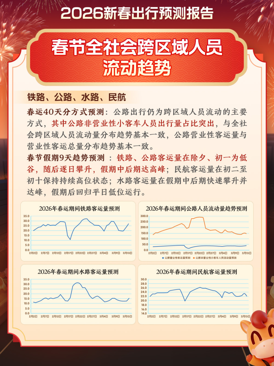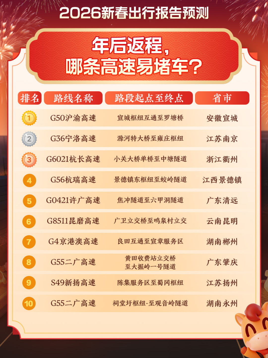 这个春节最添堵的地方都被预判了 2026年春运已经正式开启,根据2026春运出行预测数据显示,今年春运跨区人员流动量再创新高!春运期间高速拥堵排行及区域流动趋势在报告中一目了然,开车返乡的人要提前规划好时间及路线,错峰出行避免因拥堵而造成的时间浪费!