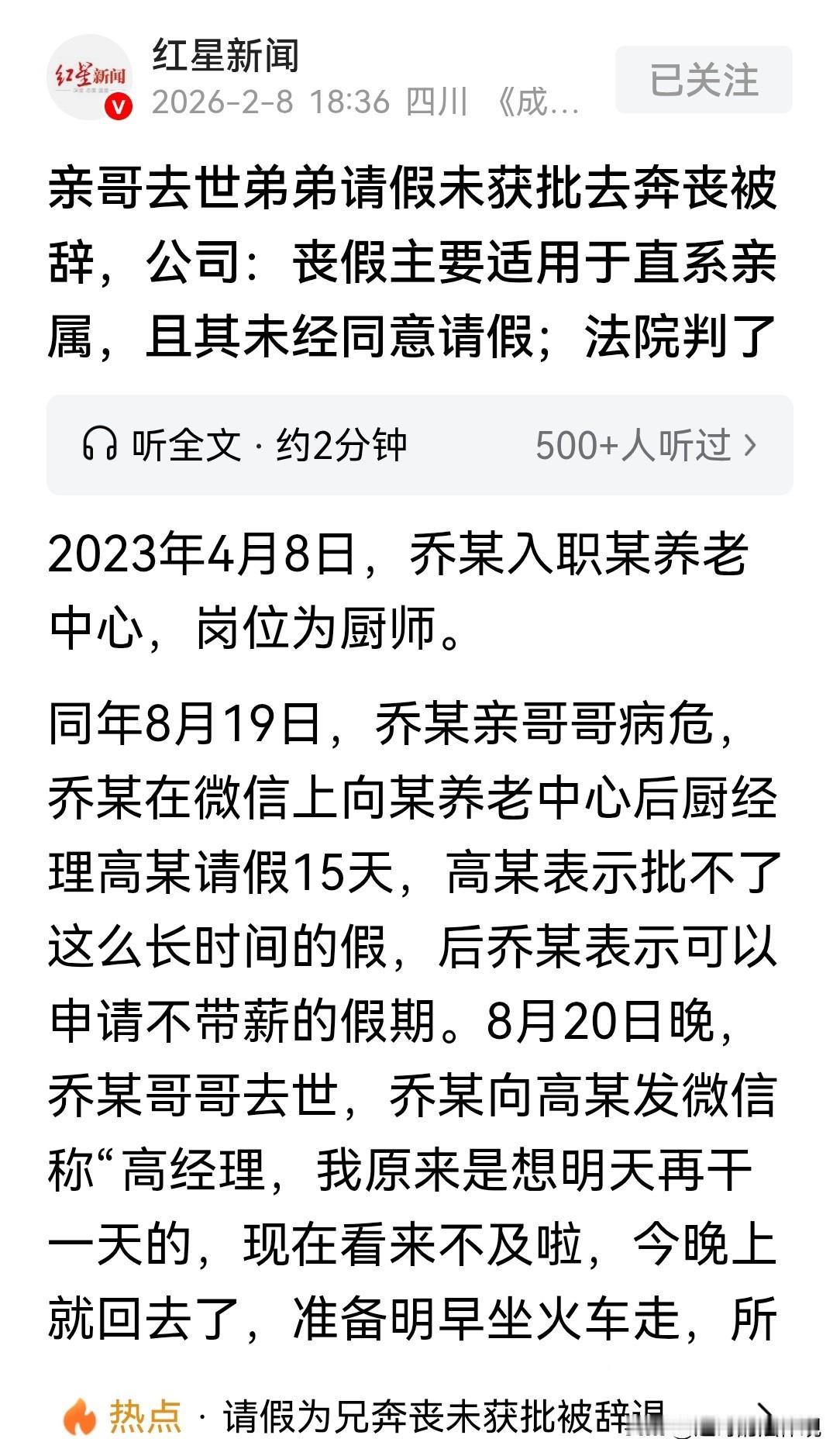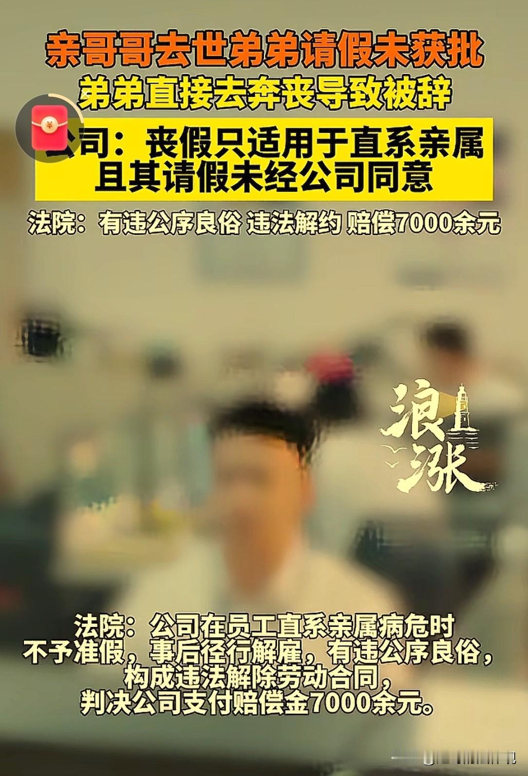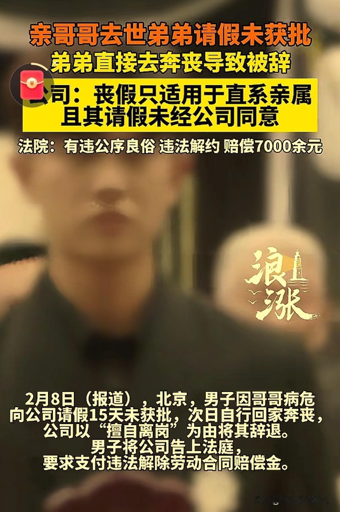 真没人性!北京,男子收到家里来电,哥哥病危,他想请假15天,领导称哥哥不是直系亲属没批假,男子提出请不带薪事假,仍被拒绝。哥哥去世,男子给领导再次请假后,直接回家奔丧。5天后,男子被直接辞退了。他不服,将公司起诉到法院,然而,判决出乎了双方的意料! 乔某在一家养老中心当厨师,2023年4月8日入职。 8月19号,他接到电话,亲哥病危,人可能不行了。 两人是一奶同胞,乔某就想回老家见亲哥最后一面。 他跟后厨的经理高某请了15天的假。 经理说,他是主厨,一走这么多天可不行,自己批不了这么长的假。 乔某一心想回家尽孝,就退了一步,说他可以请不带薪的事假。 意思是我不工资了,但假你得给我。 在老家,这么重大的事不赶回家,会被亲戚朋友误解为不懂人情。 但领导仍未答应。第二天,乔某接到了消息,哥哥去世了。 乔某再次给高经理发消息:自己原来是想明天再干一天的,现在真来不及了,准备明早坐火车回老家,所以向你请假。 乔某其实也挺无奈的,本来是还想坚持一天,但事情真等不了人了。 发完这条信息,乔某想着这是丧假,领导怎么着也会批准的。 虽然没等到领导回复,他还是直接坐车回老家了。 8月25号下午,乔某处理完家里的事。 在回单位的路上,他给高经理发了一条消息说,经理,我现在正在回去的路上,明天上班。 这意思很明确,我回来了,准备复工。 但高经理的回复,直接把路堵死了! 高经理让他下周一到办公室写辞职信,明天就不用进公司了。 意思很明显,让乔某自己主动走人。 乔某没写辞职信,他没觉得自己有过错,公司为啥就辞退了他? 随后,养老中心给他发了一封正式的辞退信。 辞退理由:乔某8月21号,在“未告知病危人员与其亲属关系、未出具医疗部门诊断结果。 且公司未做好相应工作安排,未获同意的情况下,擅自离岗至8月25日。 公司根据这些,决定把他开除。 乔某不服,他觉得这分明是违法开除员工。 他就去申请了劳动仲裁,但仲裁没解决。 乔某干脆告到了法院,要求公司,支付违法解除劳动合同的赔偿金。 在法庭上,养老中心咬定两点:一,丧假按规定只给直系亲属,哥哥不算; 二,乔某请假没有得到公司的批准,属于擅自离岗,严重影响了后厨的工作。 公司按规章制度办事,员工违规被开除合情合理。 乔某则主张,哥哥病危、去世,属重大突发事件,自己多次通过微信向经理请假。 请假确实未被明确批准,但那是领导没给他回复。 自己是在情况紧急下离岗,事出有因,并非无故旷工。 法院认为,开除员工,是劳动合同里,最严厉的一种处罚。 意味着员工一下子丢了饭碗。 所以,公司在行使这个权力的时候,不能光看自己定的规矩。 也要根据当时的现状,和情况,要审查开除决定整体上合不合理。 法院认为,乔某的亲哥病危继而去世,这是客观发生的重大变故,属于人之常情里最重要的事情之一。 乔某为此向单位请事假,这个请求,本身是正当和紧迫的。 养老中心在这个情况下,直接不予准假。 事后又用员工擅自离岗、严重违反规章制度,作为理由,二话不说就给开除了。 这个做法,与生活中普遍遵循的家庭伦理,和善良风俗是相违背的。 再说,在养老中心也拿不出,其他合法开除乔某的理由的前提下,解除劳动合同构成了违法解除。 事情发生后,人们对养老中心领导不近人情,不批假,还要开除员工的事议论纷纷。 有人认为,直系亲属可以请丧假,哥哥不是直接亲属,但可以请事假,但公司不批,有违公序良俗。 有人较真称:骂单位的请看清楚,乔某晚上突然请假,第二天就走了。 那么第二天的饭谁来做?现找厨师也得有时间吧,养老中心那么多人等着吃饭呢。 一年轻员工,道出自己曾发生事:他奶奶去世,晚饭后收到消息。 他犹豫着跟领导说,奶奶不在了,想回去奔丧,可能要三五天。 领导快速的回话:节哀顺变,你现在开车回去,路上注意安全,处理好再回来。 后面发工资也没少一分,遇上这样的领导,能不卖命工作吗,所以规定是死的,人是活的。 依据《劳动总局……职工请婚丧假和路程假问题的通知》中:职工本人结婚或职工的直系亲属(父母、配偶和子女)死亡时,可以根据具体情况,由本单位行政领导批准,酌情给予一至三天的婚丧假。 本案中,虽然乔某的哥哥不属于直系亲属范畴。 但乔某请假,是因哥哥病危去世这一重大变故,具有正当和紧迫的本质。 从公序良俗角度看,兄弟之情血浓于水,回家奔丧是人之常情。 养老中心,以非直系亲属为由不批假,以擅自离岗为由辞退乔某,违背了人文关怀和公序良俗。 最终,法院做出了终审判决:养老中心违法解除劳动合同,向乔某支付赔偿金,7000多元。 事后有人问,没给员工批事假的那位,如果他自己的兄弟姐妹去世,他是一律都不参加吗? 对此事,你怎么看? 关注@赵哥的法律观
