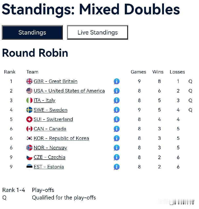米兰冬奥会冰壶男女混合成绩榜(2026-2-9) 排名/国家/轮次/胜/负 1 🇬🇧-英国 9 8 1 Q 2 🇺🇸-美国 8 6 2 Q 3 🇮🇹-意大利8 5 3 Q 4 🇸🇪-瑞典 9 5 4 Q 5 🇨🇭-瑞士 8 4 4 6 🇨🇦-加拿大8 3 5 6 🇰🇷-大韩民国8 3 5 6 🇳🇴-挪威8 3 5 9 🇨🇿-捷克8 2 6 9 🇪🇪-爱沙尼亚8 2 6 英国、美国、意大利、瑞典进入前四名的半决赛。