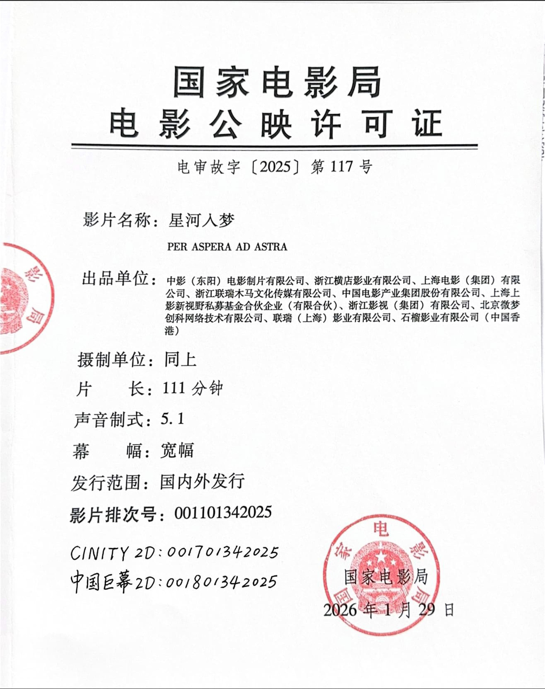 影讯 02.17大年初一星河入梦 影片信息(9点上片)外文片名:PER ASPERA AD ASTRA国 别:中国类 型:科幻、冒险、奇幻片 长:111分钟幕 幅:宽银幕声 制:5.1语 别:国语发行版本:数字2D、CINITY 2D 60帧、CINITY LED 2D 60帧、中国巨幕2D、4DX放映期限:2026年02月17日 09:00 - 2026年03月18日