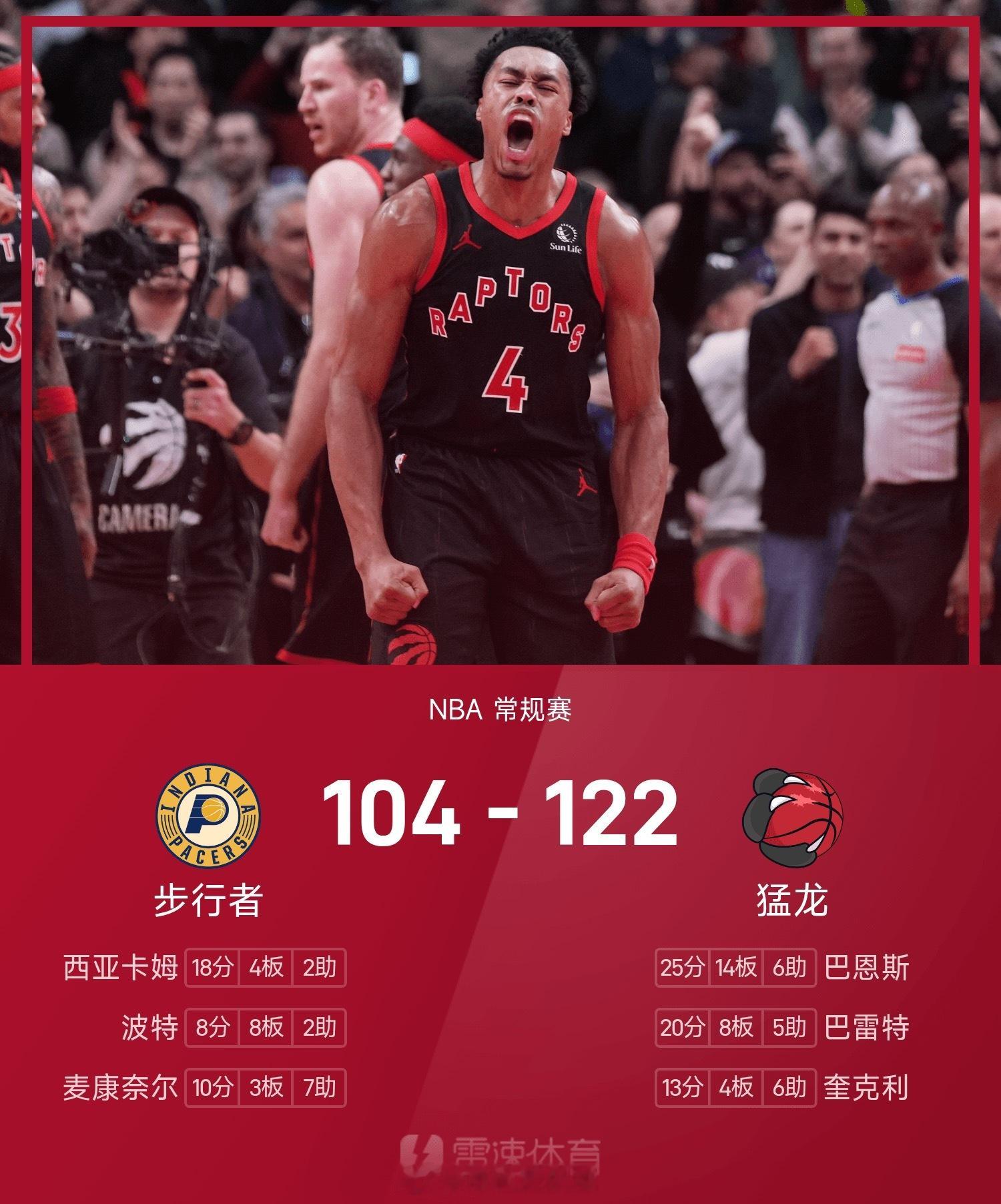 NBA战报:巴恩斯25分14板,猛龙122-104赛季横扫步行者 25/26赛季NBA 常规赛,猛龙对阵步行者。双方全场战罢,猛龙122-104战胜步行者。巴恩斯砍下全场最高的25分14板6助,率领猛龙成功取胜。NBA