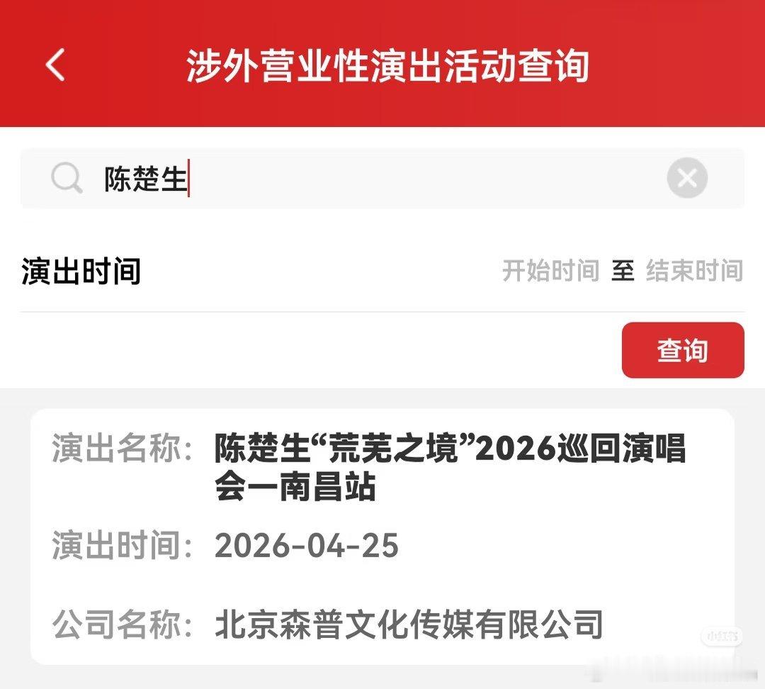 陈楚生“荒芜之境”2026巡回演唱会—南昌站批文下来了! 2026年4月25日举行。