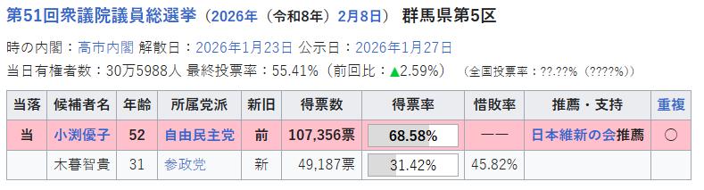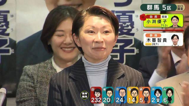 群马五区作为小渊家族的铁票区,小渊优子顺利当选。小渊优子已经当选10届。小渊优子,1973年出生,曾任安倍内阁经济产业大臣,现任日中友好议员联盟事务局长。