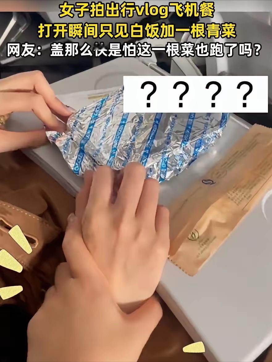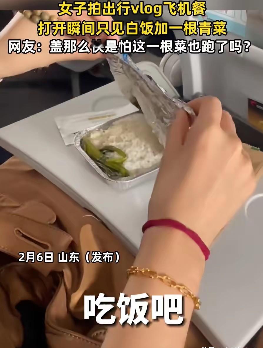 伤害性不高侮辱性极强!山东,一女子坐飞机出行,飞机起飞不久空姐就端上来飞机餐,万万没想到,女子把盖子打开一看,里面就只有一碗饭加一根青菜,吓得女子连忙盖上了盖子。网友:盖那么快是怕这一根菜也跑了吗? 2026年2月7日,山东这位女子趁着闲暇时间,乘坐国内某航班出行,至于具体的航班号和出行目的地,女子并没有在视频中透露。 据女子后续在评论区补充,她当天买的是普通经济舱机票,不算廉价航空的特价票,所以登机的时候,就默认飞机上会提供免费的热餐。 毕竟不管是以前坐飞机的经历,还是身边朋友的反馈,普通航班的飞机餐,就算不算丰盛,至少也会有主食、小菜,偶尔还会搭配水果或者小点心,所以她从登机开始,就隐约期待着这份飞机餐。 飞机顺利起飞后,大概平稳飞行了半个小时左右,空乘人员就推着餐车,开始逐一向乘客分发飞机餐,女子坐在靠窗的位置,看着餐车慢慢靠近,还特意整理了一下面前的小桌板,做好了吃餐食的准备。 空乘人员递来餐盒的时候,还笑着说了一句“请慢用”,女子接过餐盒,手感还是温热的,心里还暗自想着,看来这份餐食应该还不错,至少是热乎的,能缓解一下旅途的疲惫。 可当她轻轻掀开餐盒盖子的那一刻,整个人都愣住了,脸上的期待瞬间消失不见,取而代之的是一脸的惊讶,甚至下意识地就快速合上了盖子,动作快到连自己都没反应过来。 女子后来回忆说,当时完全是本能反应,打开盖子看到里面的样子,第一反应就是“是不是拿错餐盒了”,或者“是不是还有另外一份没递过来”,毕竟这样的飞机餐,她从来没见过,也从来没听说过。 女子缓过神来之后,又小心翼翼地把盖子掀开一条缝,确认了一下,里面确实只有满满的一碗白米饭,旁边孤零零地放着一根青菜,没有任何其他小菜,没有肉,没有蛋。 甚至连一点咸菜或者酱料都没有,那根青菜细细小小的,大概只有手指那么长,颜色倒是还算新鲜,却显得格外突兀。 女子无奈之下,就把这一幕用手机拍了下来,没有添加任何多余的文案,只简单配了一句“不敢睁开眼,希望是我的幻觉”,然后发布到了网络上,没想到短短几个小时,就引发了全网热议。 视频走红之后,很快就吸引了大量网友的围观和评论,评论区瞬间就炸了锅,大家的看法不一,有人觉得特别好笑,有人则表示自己也有过类似的经历。 最热门的一条评论就是“盖那么快是怕这一根菜也跑了吗?”,这句话很快就被网友们争相转发,成为了调侃这件事的热门话术。 还有网友开玩笑说,这根青菜绝对是“C位出道”,独享一碗米饭,待遇比谁都好,也有网友吐槽,这样的飞机餐,还不如不吃,简直是侮辱人,就算是简餐,也不至于寒酸到这种地步。 有不少网友质疑,女子的视频是不是摆拍,毕竟就算飞机餐再简单,也不至于只有一根青菜,还有网友猜测,女子可能乘坐的是廉价航空,而廉价航空大多不提供免费餐食,或者只提供极简餐食。 但女子很快就在评论区回应,自己买的不是廉价航空的机票,还补充说,当时掀开盖子的面积很大,一开始以为没有菜,后来仔细看才发现有一根,确实有菜,但跟没有几乎没区别。 有媒体联系到了相关航空公司的客服热线,客服工作人员表示,目前还没有收到相关的投诉反馈,同时还解释说,航空公司的配餐会根据航班线路、飞行时长、机型等因素略有不同。 通常情况下,不会出现只有一根青菜配米饭的情况,后续会进一步核实此事。其实熟悉航空行业的人都知道,近年来,不少航空公司为了降本增效,都在逐步缩减飞机餐的成本。 三大航的航空餐食费用占总营业成本的比例,相比几年前都有明显下降,旅客人均航空餐食成本也随之减少。 除此之外,还有网友晒出了自己之前乘坐飞机时遇到的极简飞机餐,有人说自己曾吃到过四个馒头加一包榨菜,还有人说吃到过一片白菜配米饭,这些吐槽也引发了不少人的共鸣。 据悉,早在2023年,就有消费者晒出类似的极简飞机餐,当时也引发了一阵热议,还有业内人士表示,目前国内对于航空公司的配餐,并没有统一的标准,餐食的种类、规格、成本等,都是由各航空公司自主规定的。 目前,女子吐槽飞机餐的事件,还在进一步发酵,相关航空公司也没有给出进一步的核实结果。女子表示,自己发布视频,并不是想故意抹黑航空公司,只是觉得这件事比较意外,随手记录分享一下,没想到会引发这么大的关注。