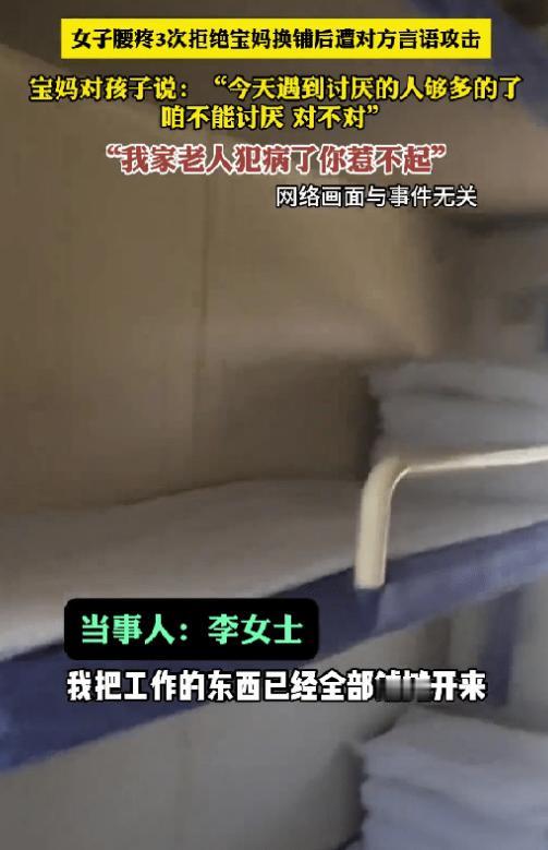 “简直坏透了!”河北衡水,一女子乘坐动车,被宝妈强制要求换铺,因为腰疼,女子3次拒绝后,万万没有想到,宝妈当着孩子的面对女子言语攻击,甚至威胁说,我家老人有心脏病高血压,如果出了事你负责!   坐动车出行,谁都想图个安稳方便,遇到难处互相搭把手,本是件暖心的事。   可总有那么一些人,把别人的善意当成理所当然,把自己的不便当成强迫他人让步的理由,用道德绑架的方式,逼着陌生人牺牲自己的权益,这样的行为,不仅让人反感,更破坏了公共空间的和谐。 衡水的李女士,就在出差的动车上,遭遇了这样一场让人糟心的闹剧。   作为常年出差的打工人,李女士的腰椎早就落下了旧伤,这段时间刚好复发,稍微动一动就疼得厉害。   这次出差路途不短,为了能在火车上好好休息,也能顺利处理手头的工作,她没舍得省那点钱,特意订了软卧下铺——不用爬上爬下,坐着躺着都方便,也能缓解腰部的疼痛。 上车后,李女士简单收拾了一下随身物品,刚把电脑打开,准备梳理一下当天的工作,就看到一家三口走进了她所在的软卧隔间。   带队的是一位宝妈,身边跟着一位老人和一个小孩,看得出来,带着一老一小出门,确实有些不方便。   这家人安顿好没多久,宝妈就主动走到了李女士面前,脸上带着几分恳求,提出了换铺的想法。 原来,这家人买票的时候没凑好,铺位没在一块儿,一个在本车厢,一个在另一节车厢,宝妈想着照顾老人和孩子不方便,就想让李女士换到另一节车厢的铺位,这样她们一家人就能聚在同一个隔间,也能互相有个照应。   换做平时,要是身体方便,李女士或许会帮忙,可这次她腰椎疼得厉害,别说换到另一节车厢来回折腾,就算是换个上铺,她也爬不上去,更别说还要处理紧急工作。 于是,李女士很客气地跟宝妈说明了自己的情况,婉言拒绝了换铺的请求。   可她没想到,自己的拒绝,并没有让宝妈放弃,反而让对方变得更加执着。   宝妈一次又一次地来找李女士,前后一共提了三次换铺的要求,每一次,李女士都耐心地解释自己的难处,没有丝毫不耐烦,可每一次,都被宝妈当成了“不近人情”的借口。 三次拒绝之后,宝妈脸上的恳求彻底消失了,取而代之的是满脸的不耐烦和戾气。   她再也不提自己的难处,也不再体谅李女士的疼痛,反而对着李女士大吵大闹,言语间全是指责和嘲讽。   更让人不舒服的是,她全程都当着孩子的面,丝毫没有顾忌自己的言行会给孩子带来什么影响,甚至拿家里的老人当借口,威胁李女士。 宝妈对着李女士放狠话,说家里的老人有高血压、心脏病,要是在火车上出了什么意外,就找李女士负责。   除此之外,她还阴阳怪气地跟孩子念叨,说今天遇到了讨厌的人,教孩子远离“不善良”的人,明里暗里都在指责李女士。   整个隔间的氛围,都被她闹得十分压抑,周围的乘客看到这一幕,都只是默默旁观,没人愿意卷入这场无谓的纷争。 李女士全程都在克制自己的情绪,没有跟宝妈争吵一句,只是一直坚定地守住自己的底线,明确表示自己确实不能换铺。   就这样,这场毫无意义的纠缠,持续了一个多小时,直到宝妈一家到站下车,李女士才终于松了一口气,得以安安静静地休息、处理工作。 事后,李女士越想越委屈,就把自己的这段经历发到了网上,没想到一下子就火了,引来很多网友的关注和讨论。   几乎所有网友都站在李女士这边,纷纷吐槽那位宝妈的做法太过分,还有很多网友分享了自己类似的经历——出门在外,被陌生人以各种理由要求换座、换铺,拒绝之后就被指责“冷漠”“不近人情”,那种无力感,只有经历过的人才懂。 有网友说,换铺从来都不是别人的义务,愿意帮忙是情分,不愿意帮忙是本分,没人有义务为了别人的便利,牺牲自己的权益。   还有网友吐槽,现在很多人都这样,一旦自己有难处,就觉得全世界都得让着自己,一旦被拒绝,就立刻翻脸,用道德绑架的方式逼迫别人,丝毫不会考虑别人的感受。   铁路部门早就明确说过,动车换铺,全程都遵循自愿原则,乘客花钱买了铺位,就依法享有使用铺位的权利,有权拒绝任何非自愿的换铺要求,任何人都不能强制别人让出自己的铺位。   李女士的做法,没有任何问题,她只是在正当维护自己的合法权益,而那位宝妈,不仅无视规则,更是践踏了别人的善意。 很多网友也给遇到类似情况的人提了建议,遇到这种道德绑架的人,没必要跟他们过多纠缠,也不用因为他们的指责而自我怀疑,保持冷静,坚定地拒绝就好,如果对方一直纠缠不休,就直接找乘警或者乘务人员帮忙,别让自己受委屈。   还有网友建议,应该加大对这种行为的处罚力度,让那些蛮不讲理的人,付出应有的代价。